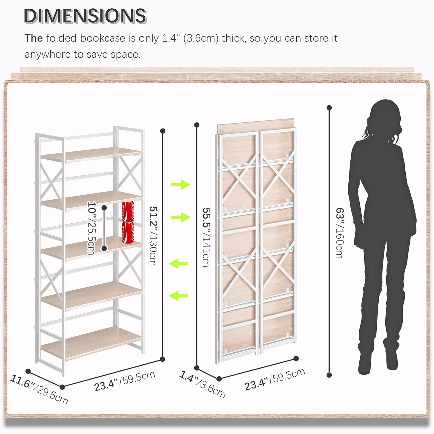 4NM 5 Tiers No Assembly Book Shelves, 51.2" H Folding Bookshelf Bookcase Open Industrial Foldable Shelves for Bedroom, Living Room, Home Office - Natural White