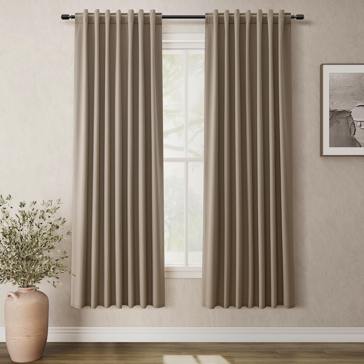 - Thermal Insulated Room Darkening Curtains: The blackout curtains with 300GSM high-density linen blend fabric block out the heat in summer and cool air in winter while sunlight blocking and soundproof. Provide a easy and comfortable home.