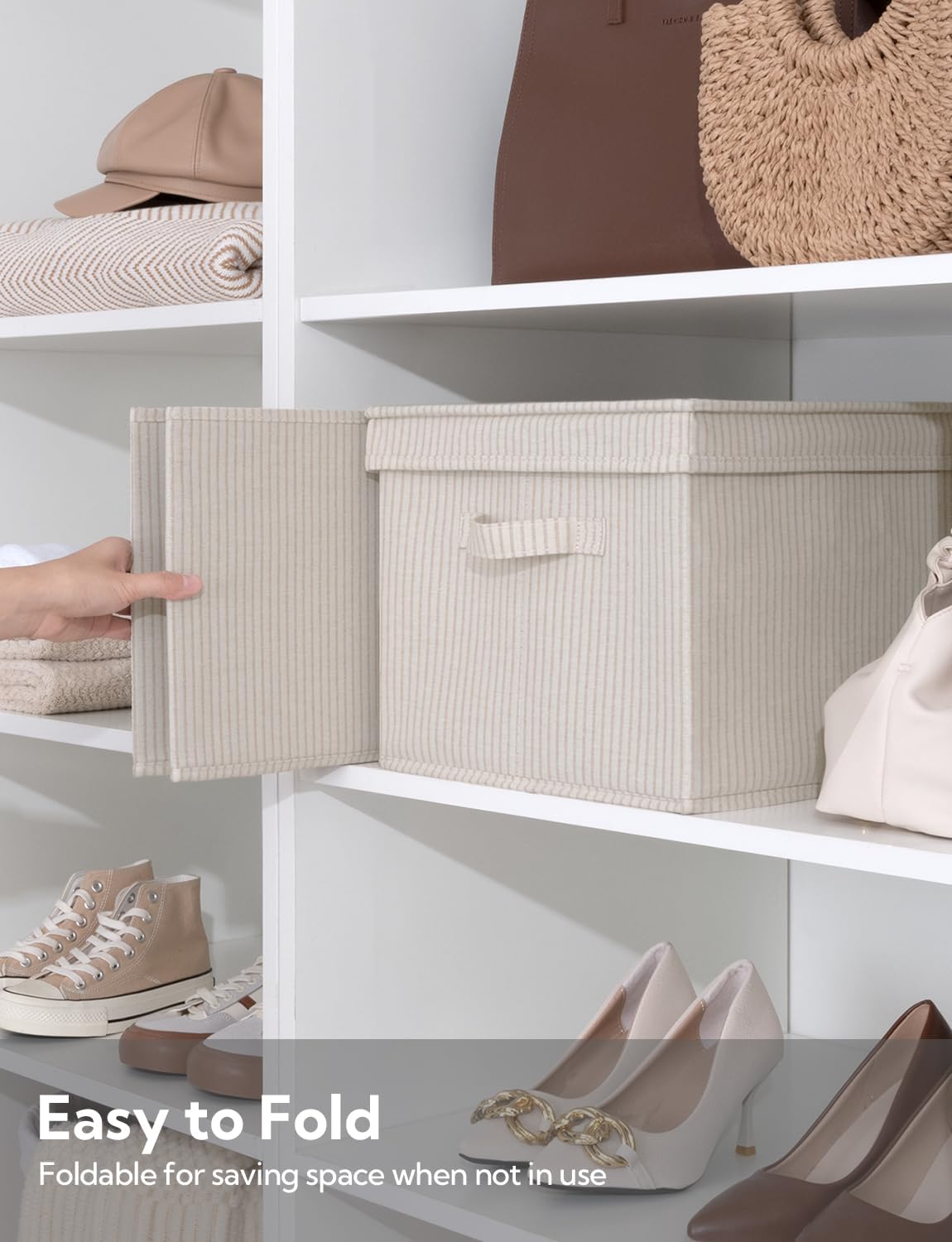 StorageWorks Storage Bins with Lids, Decorative Storage Boxes with Lid and Handles, Foldable Storage Baskets for Closet, Shelves, Stackable, Khaki Stripe, Jumbo, 3-Pack