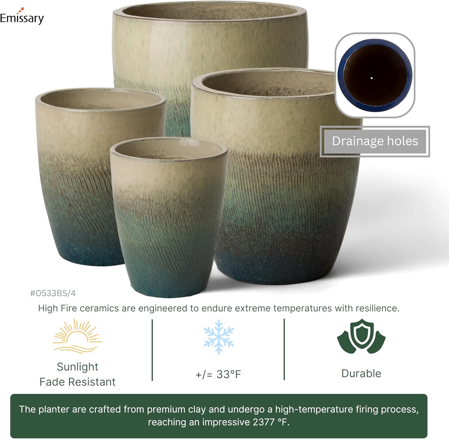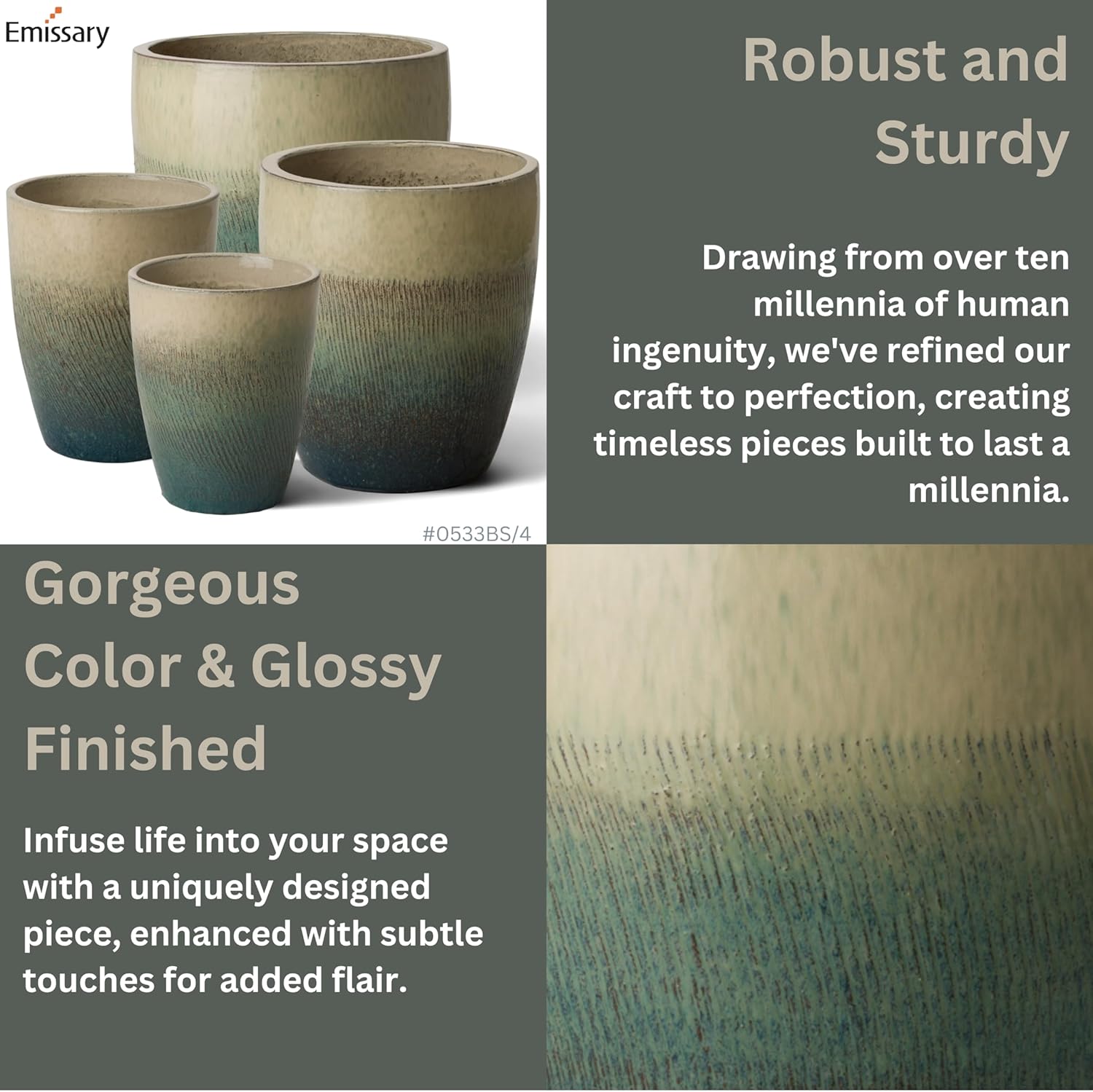 - Lush Bayside Green Color with a Glossy Glaze Finish: Enhances Indoor and Outdoor Spaces with an Elegant Sophistication