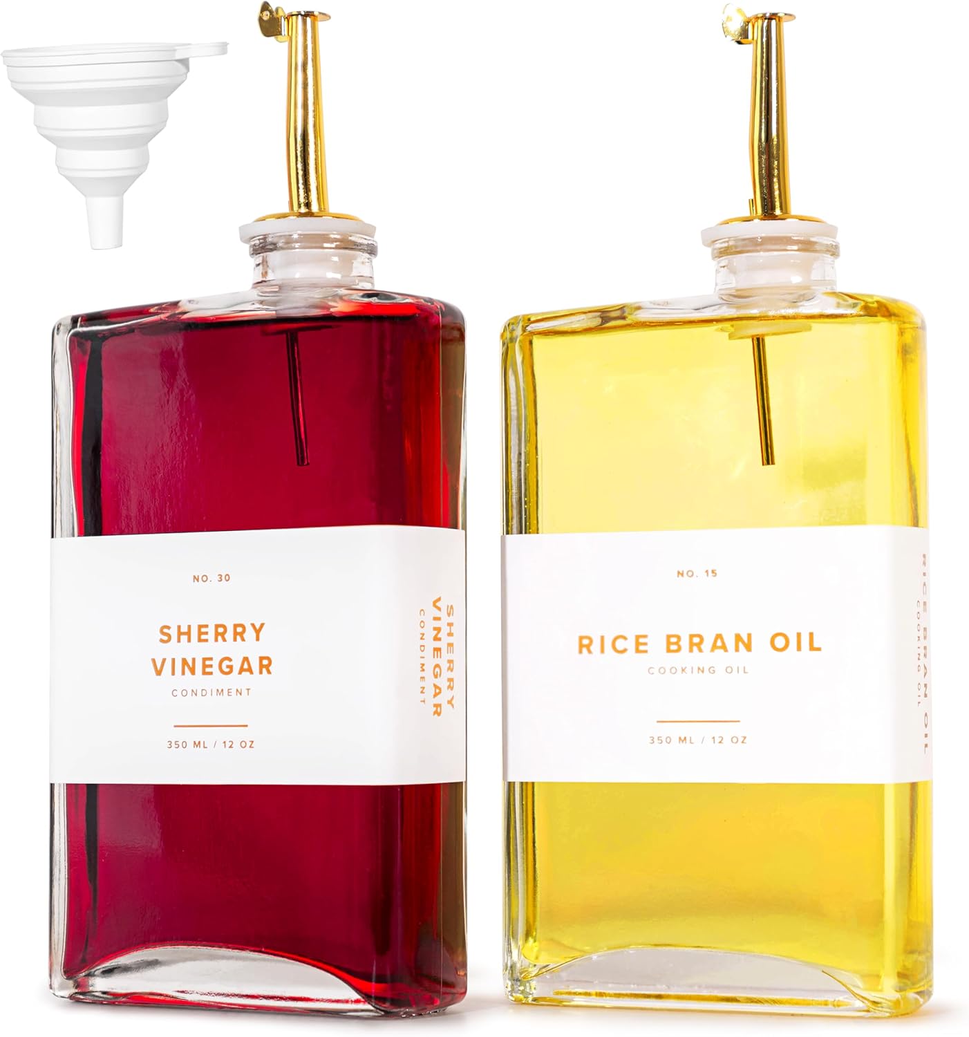 - ELEGANT GLASS OIL DISPENSER FOR KITCHEN: This premium oil and vinegar dispenser set includes two 17oz glass oil bottles for kitchen, designed to keep your favorite oils and vinegars fresh while adding a sleek touch to your kitchen.