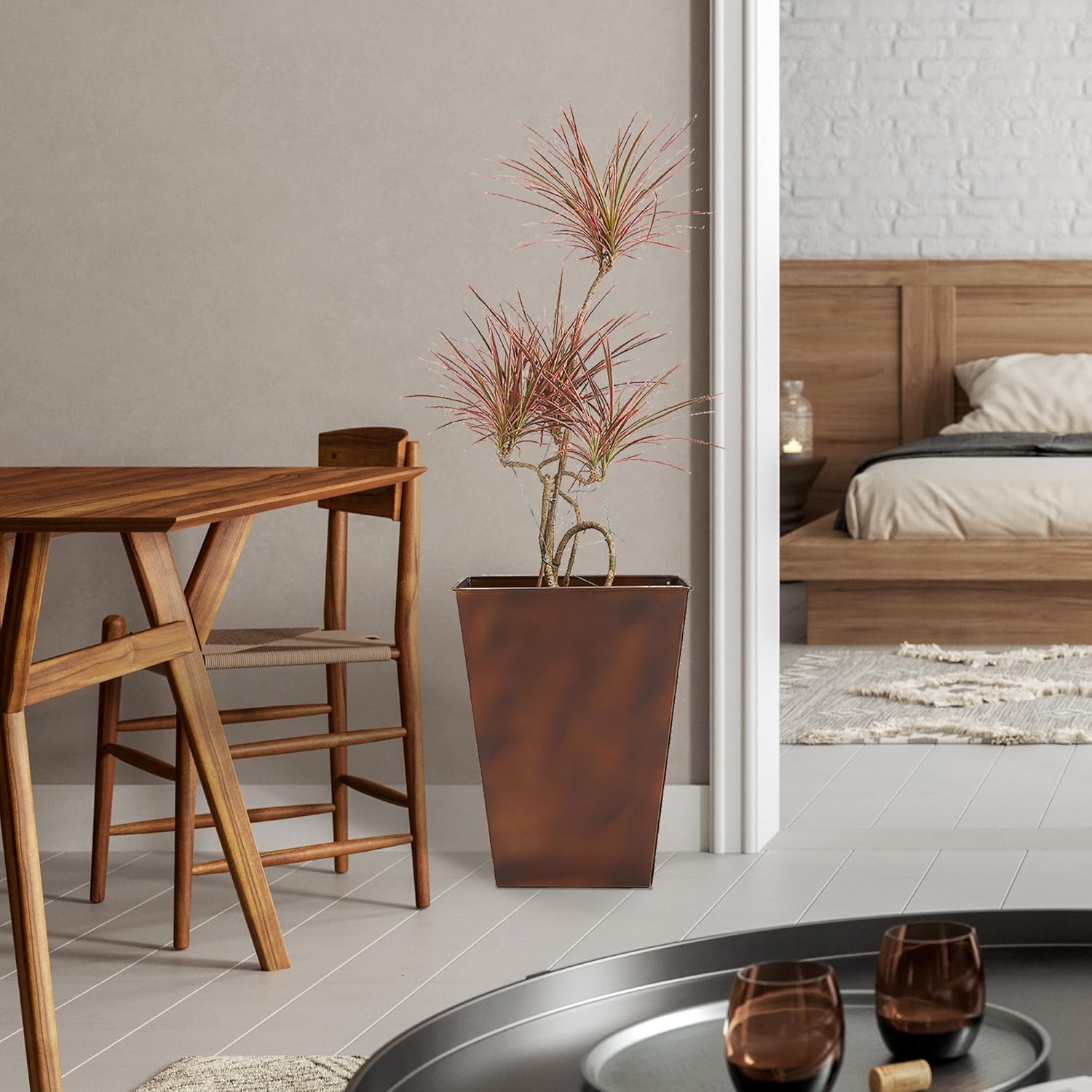 Worth Garden 14" Dia x 18" H Large Metal Floor Planter Set of 2, Matte Bronze Retro Finish Tall Square Tapered Steel Plant Pots, Decor Flower Pot Indoor & Outdoor, Drainage Hole