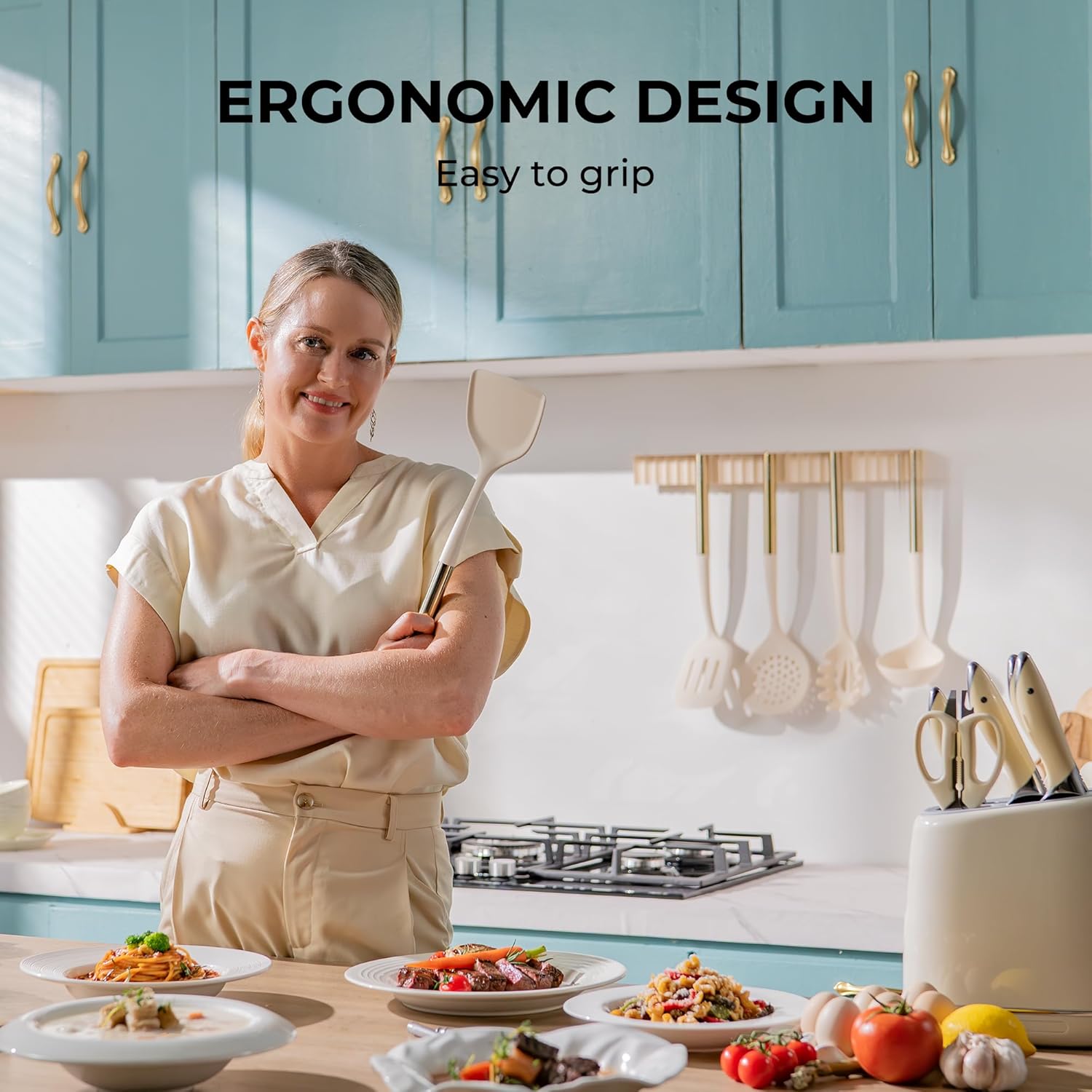 - 【Stylish & Gift-Ready】A must-have 5-piece utensil set with 1 magnetic stand. White silicone heads and gold stainless steel handles add elegance to any kitchen—an ideal gift for weddings, holidays, and housewarming parties.