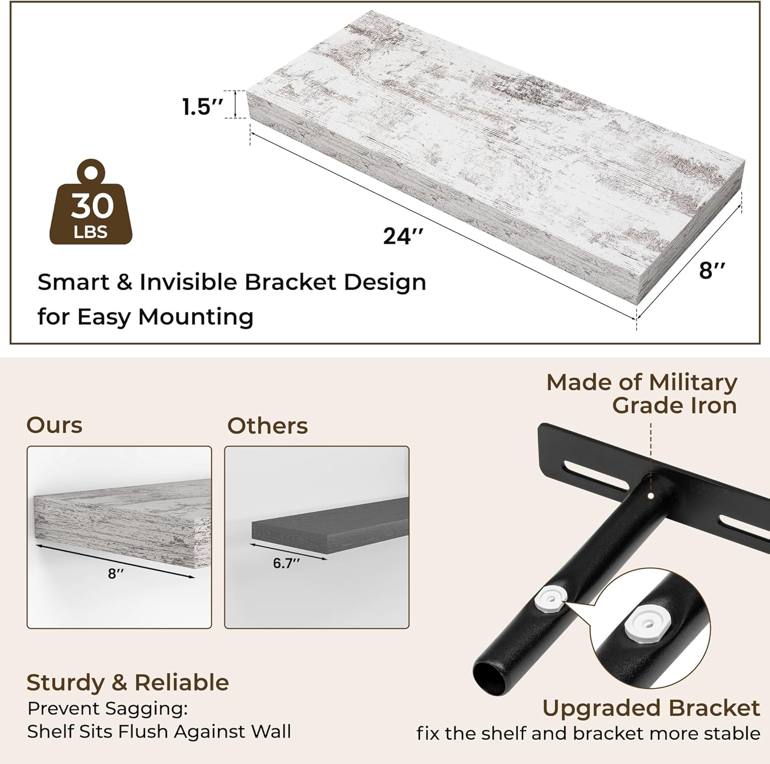 - 24 Inch Floating Shelves for Wall (Set of 2): Each wall shelves are 8 inches in depth and 1.5 inches in thickness. 2-piece set is more cost-effective and practical. Our wall shelf can be used in combination, staggered high or low on the wall, or mounted side-by-side to provide extra storage space for organizing small items and clutter in multiple areas such as kitchens, bathrooms, and bedrooms, creating a clean and smooth look. Multiple colors available