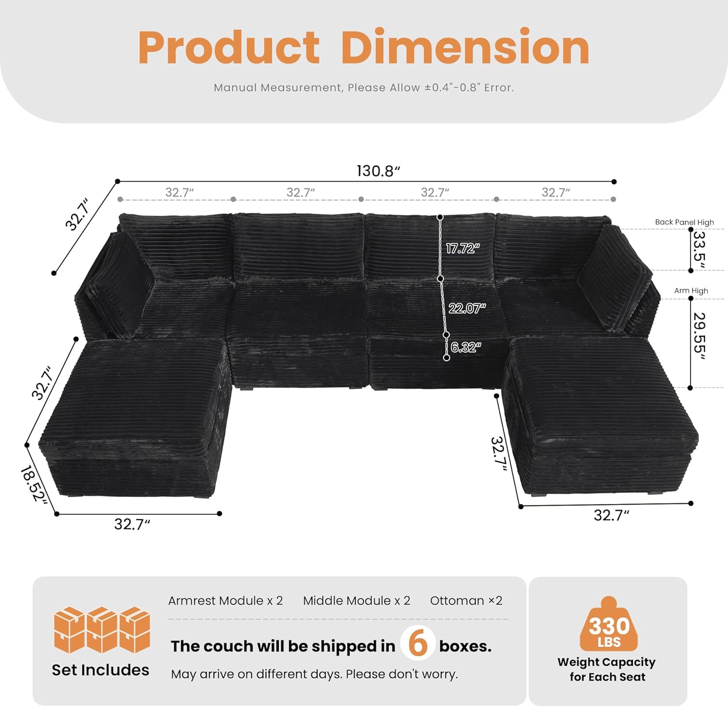 - Modular Sectional: 100% Free combination with 6 pieces individual sections. Make it straight I shape, U shape, L shape, bed shape, etc. Versatilely fits for daily use, family happy hours, party hosting