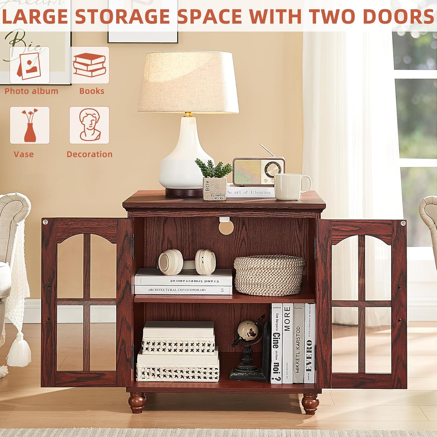 - Farmhouse end table : This farmhouse large side table boasts an exquisite appearance, with a unique design that adds charm to your home. The combination of glass barn doors and modern artistic elements creates a refined and elegant storage cabinet, enhancing the overall ambiance of your space and making it visually captivating from any angle.