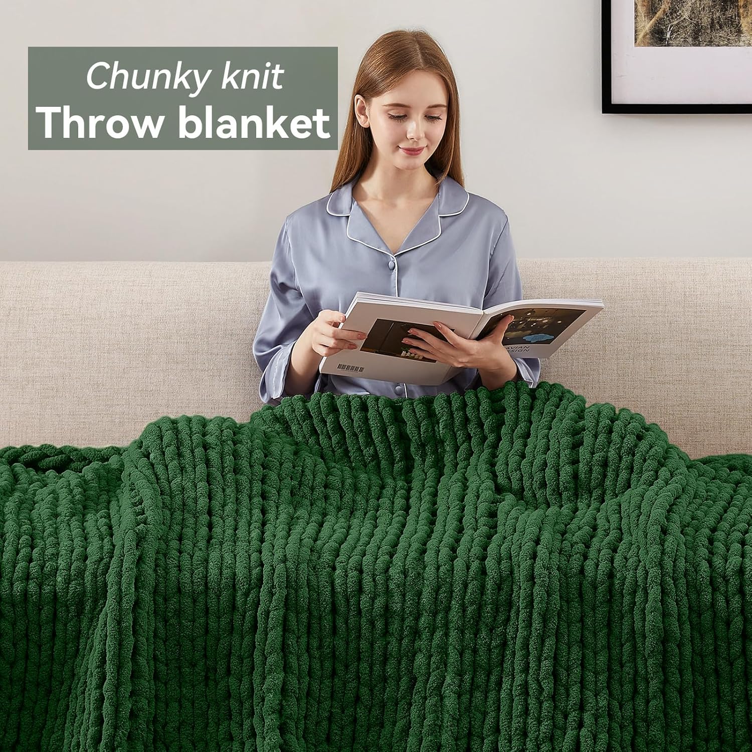 Chunky Knit Throw Blanket, 40''*50'' Knitted Throw Chenille Yarn for Bed Couch, Handmade Grass Green Crochet Big Thick Blanket, Machine Washable Cute Comfy Blanket for Home Decor