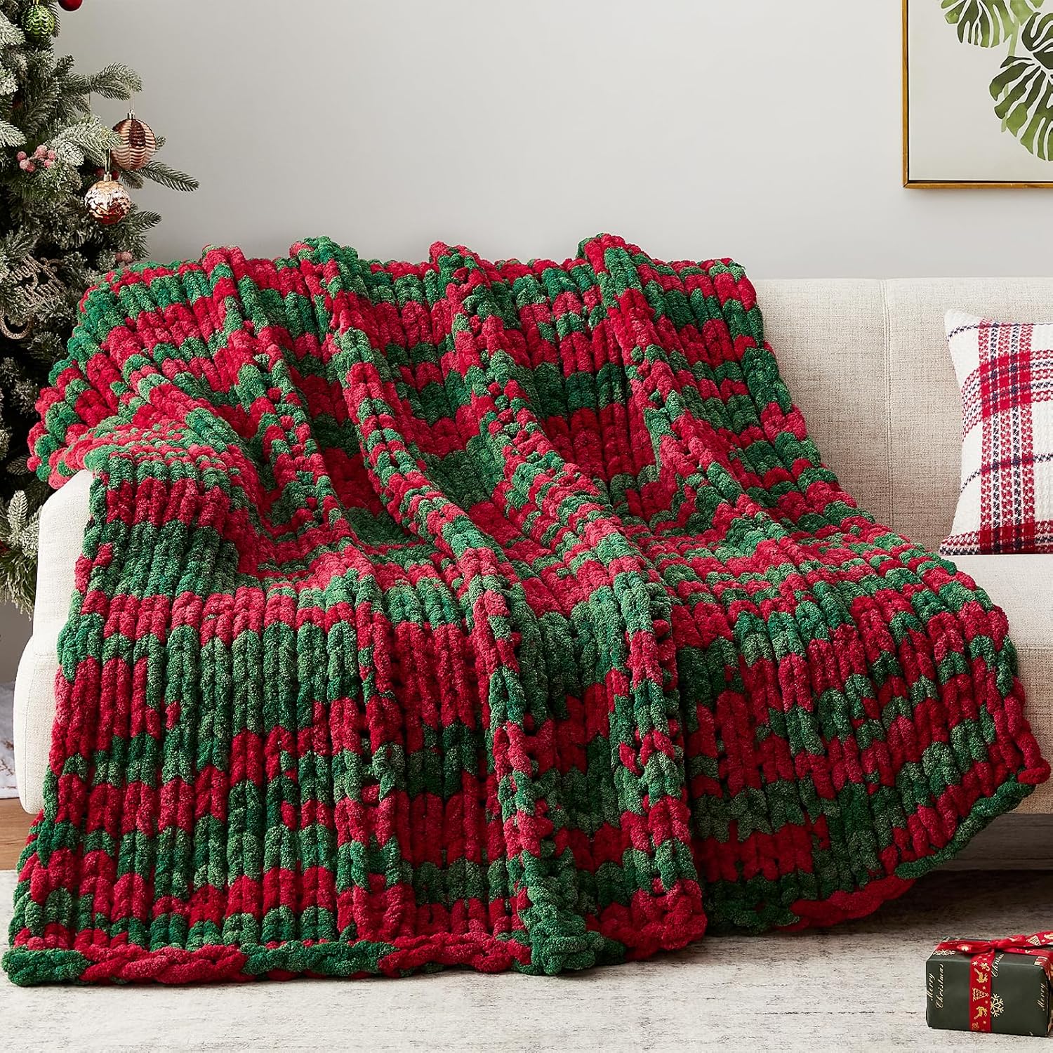 Chunky Knit Throw Blanket, 60''*80'' Knitted Throw Chenille Yarn for Bed Couch, Handmade Stripe Crochet Big Thick Blanket, Machine Washable Cute Comfy Blanket for Home Decor