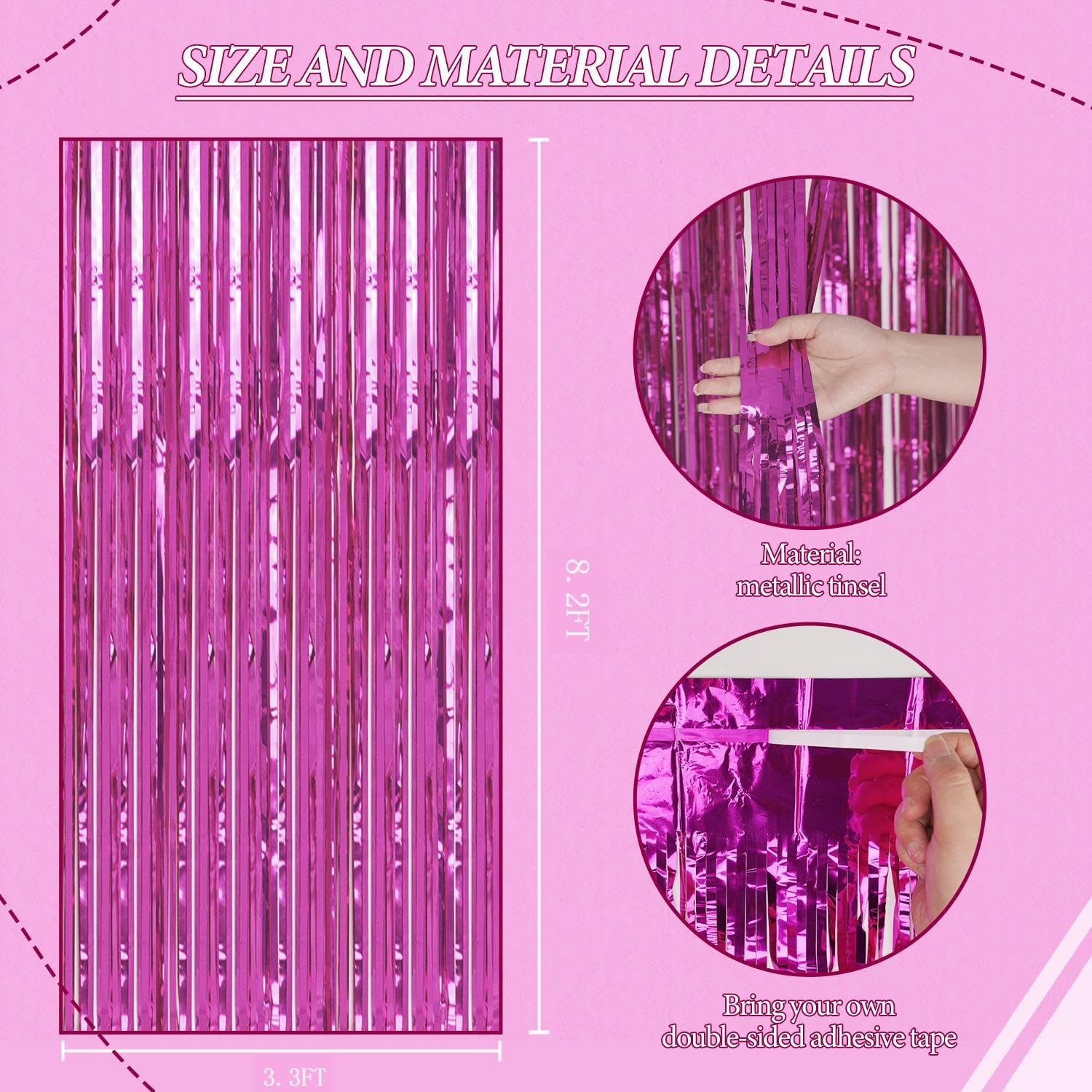- 【3 Sets of Foil Fringe Curtains】Each package includes 3 sets of 3.3x8.2 ft foil fringe curtains, providing enough length to decorate your party with ease. Perfect for creating a stunning backdrop for any occasion.