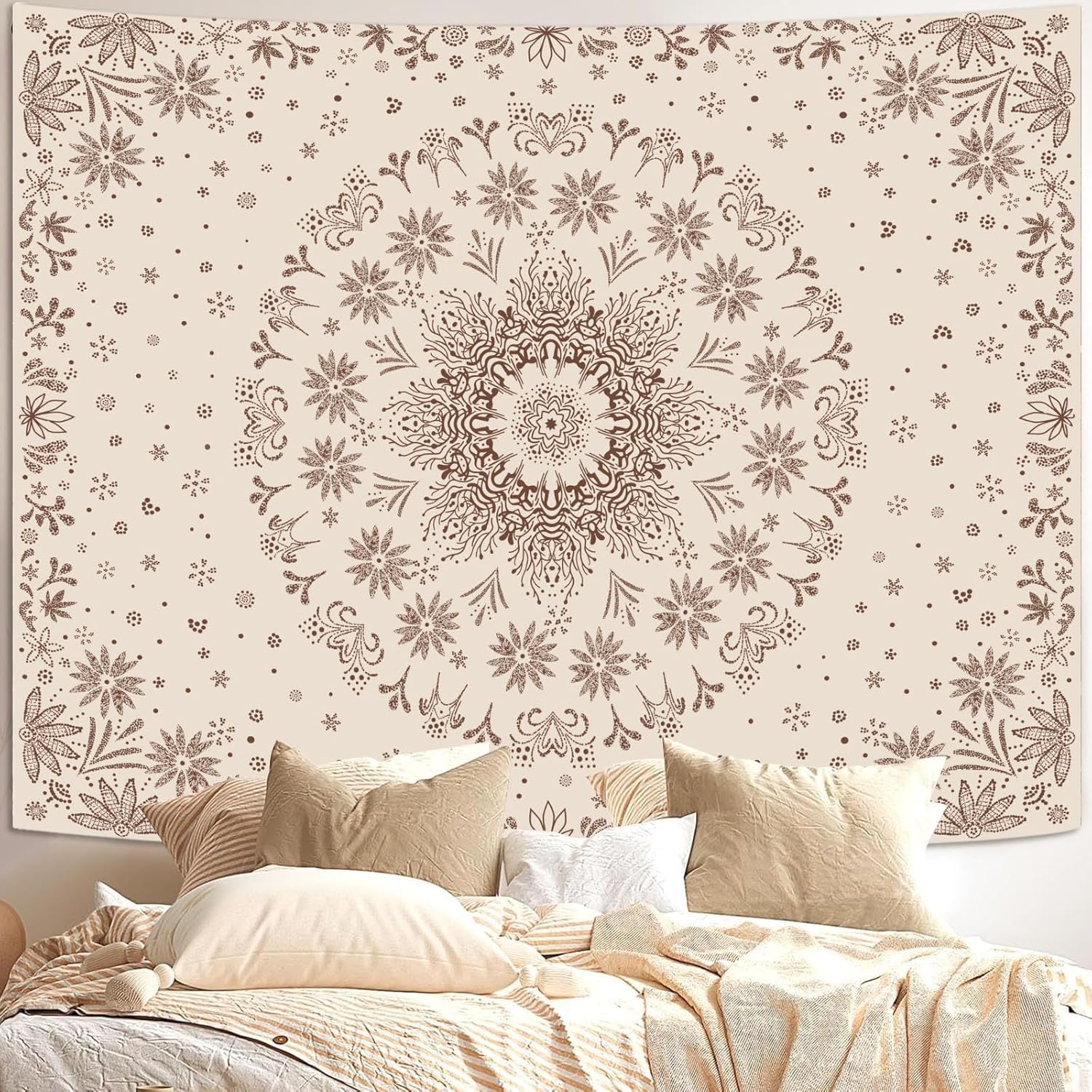 Fowocu Boho Floral Mandala Tapestry Wall Hanging Bohemian Flower Medallion Tapestry Aesthetic Beige Brown Hippie Indian Small Tapestries for Bedroom Living Room Dorm Decor 48 x 36 Inch