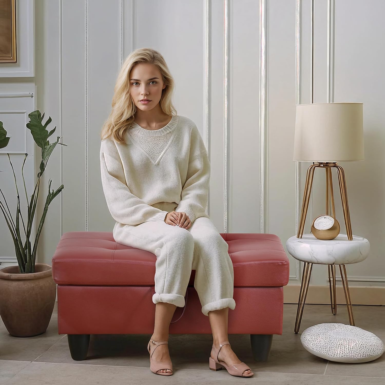 Ottoman Rectangular Storage Ottoman Bench, Faux Leather Footrest, Coffee Table, Stool Footstool with Hinged Lid for Living Room, Bedroom, Entryway, Red, 35"x23.5"x17.5"