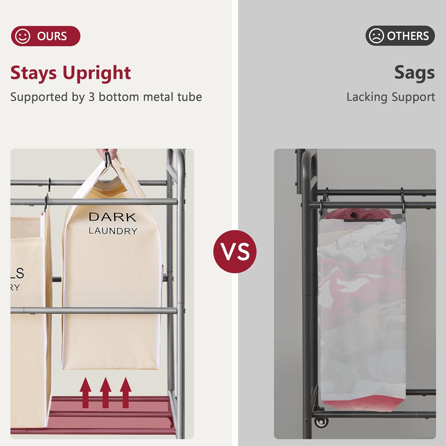 - 【Sturdy Frame】Made of heavy-duty metal frame that can hold up to 88 lbs. 7 Extra horizontal bars make the frame sturdy and prevent the bag from sagging when filled with laundry.