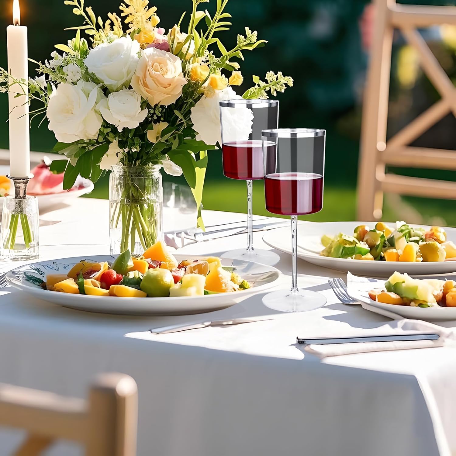 - Sleek and Stylish Design: This plastic wine glasses with stem exudes elegance and sophistication with its silver rim. Disposable wine glasses perfect for both casual and formal occasions. This plastic wine glasses disposable's sleek design ensures that you'll make a stylish statement.