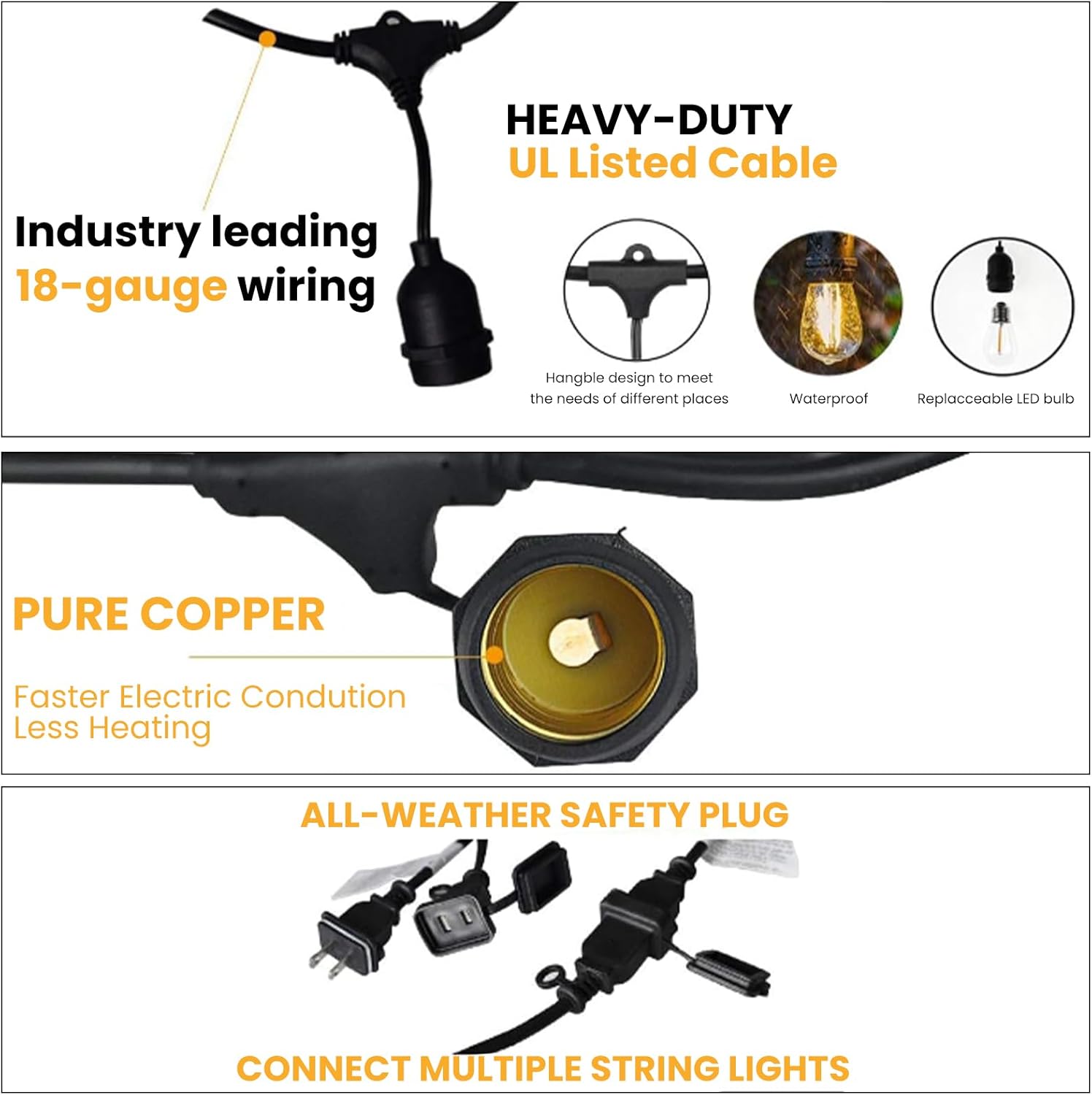 - Commercial Grade: ETL Certified with a high IP65 waterproof rating. With heavy-duty wire construction throughout the molded sockets, our outdoor patio string lights can withstand rain, sun, wind, snow, humidityβdurable for year-round outdoor use.