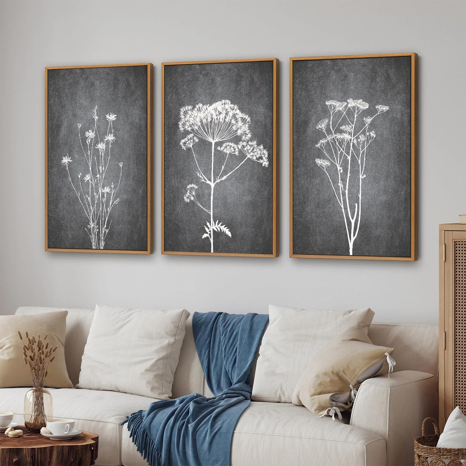 Tinonedraw Black and White Botanical Framed Canvas Wall Art Set, Vintage Floral Wall Decor, Dark Academia Minimalist Plant Art Paintings, Abstract Wildflower Art Print for Living Room Bedroom 16"x24"x3