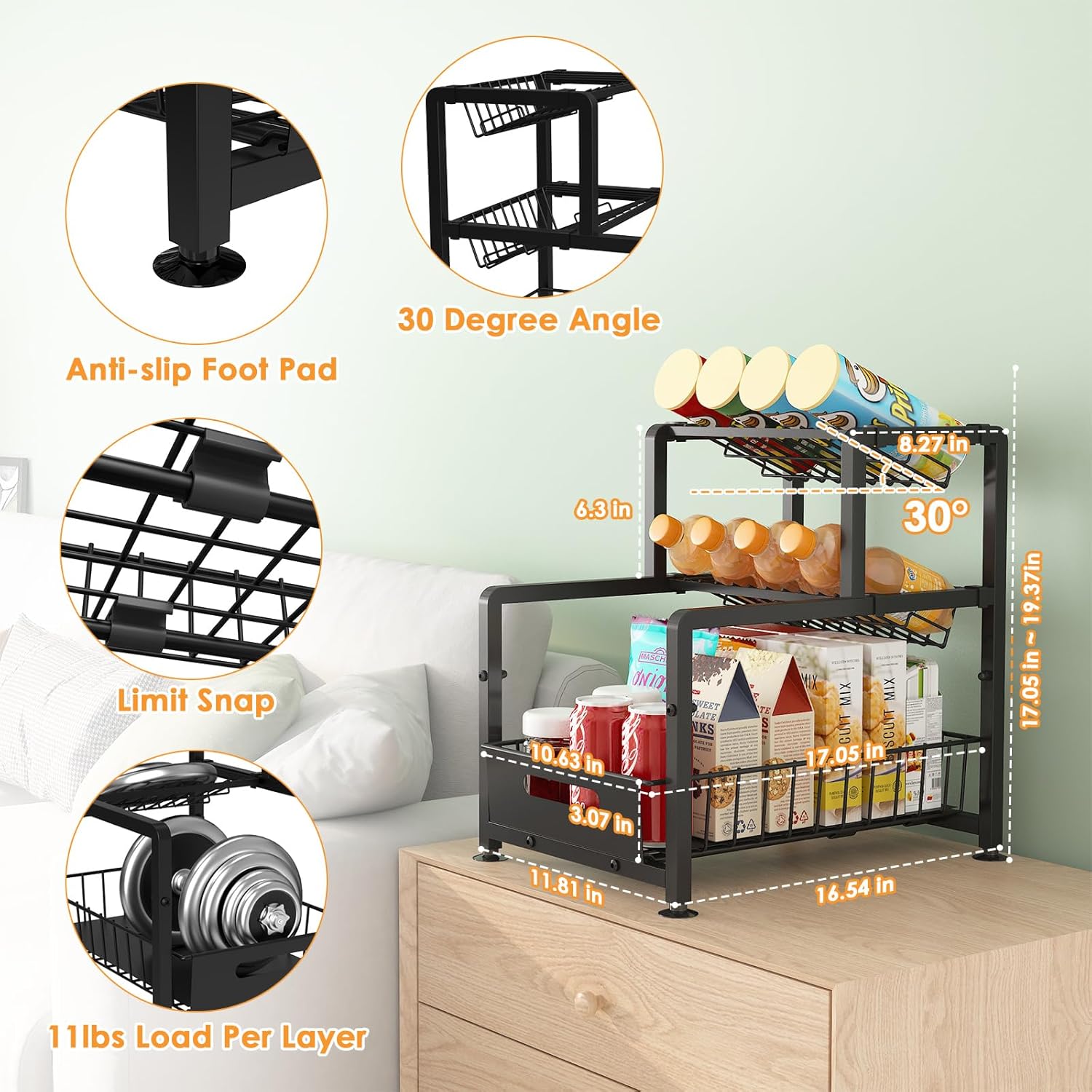 - Sturdy and Load-bearing: The seasoning organizer is made of solid metal and coated with black rust-resistant paint. Overall dimensions are 16.54 “L x 11.81 ‘W x (17.05’-19.37”)H, 11 lbs load per layer.
