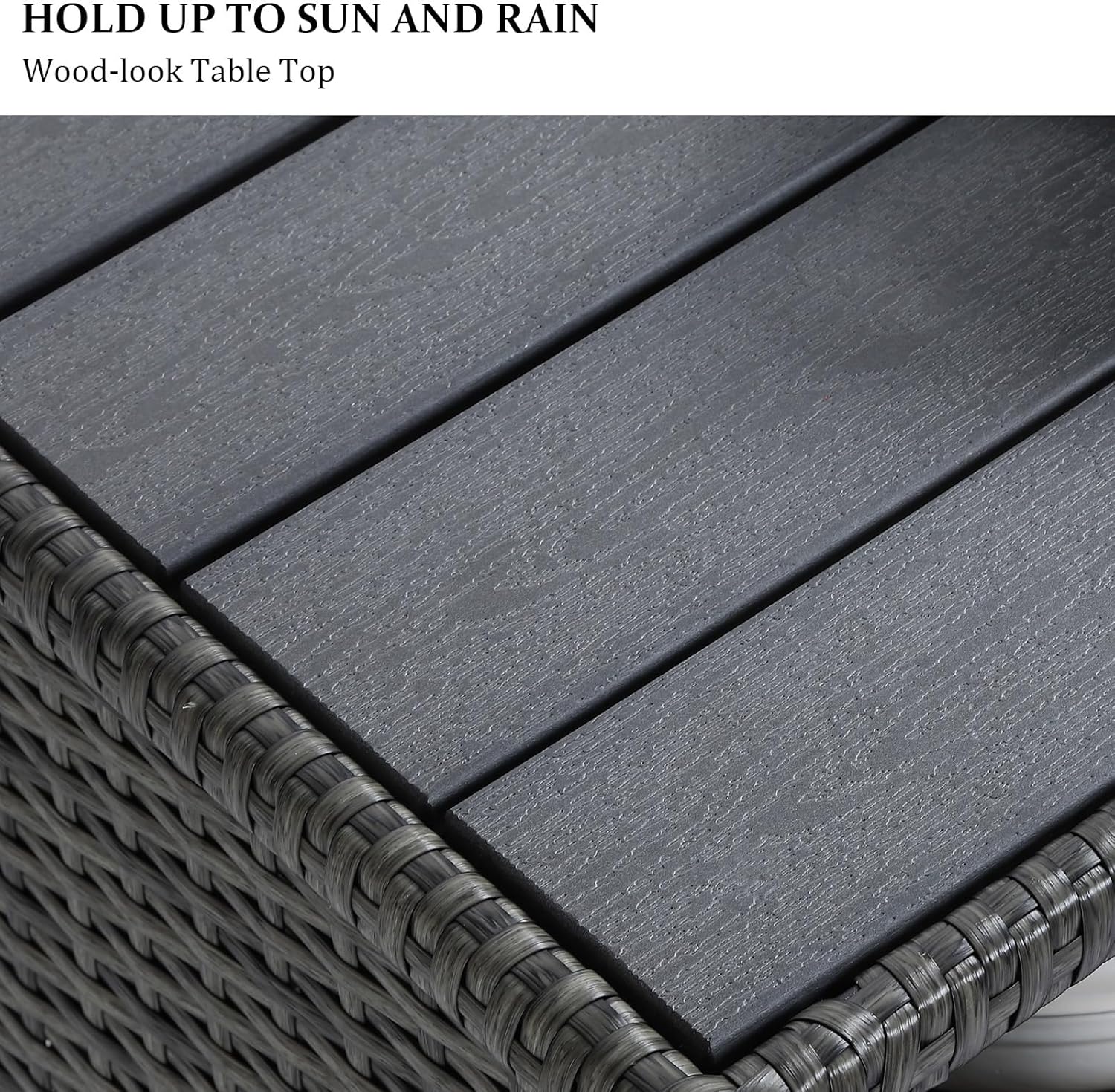 - Resin Faux Wood Top: Wicker Outdoor Bar Table with resin wood Tabletop, that mimics the look and feel of real wood.The resin wood top surface makes cleaning a cinch – a quick wipe with a damp cloth is all it takes. The sturdy steel frame of wicker storage cabinet that has been specially treated to withstand potential corrosion over time