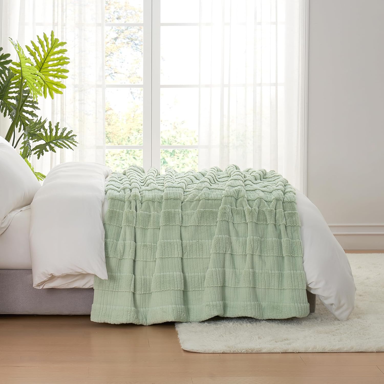 Amélie Home Luxury Striped Faux Fur Throw Blanket for Couch, Embossed Split Fur Cozy Fuzzy Fluffy Luxurious Soft Plush Sofa Chair Bed Gift Blankets for Women Men Wife Friend, 60"x80", Sage Green