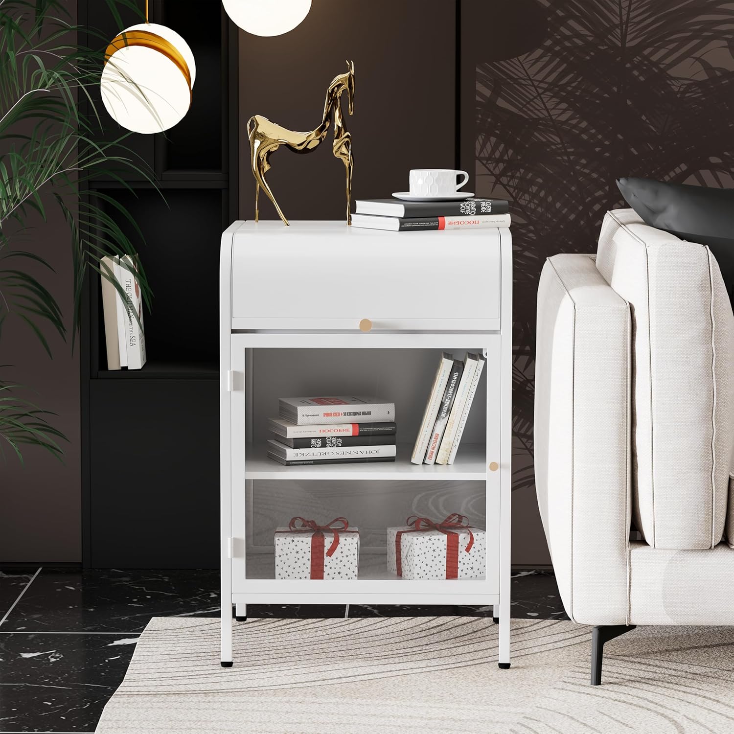 Modern Metal Side Tables, End Tables with Glass Door, 2-Tier Nightstands with Storage Shelves, Accent Table, Slim Sofa Table for Living Room, Bedroom (1, White)