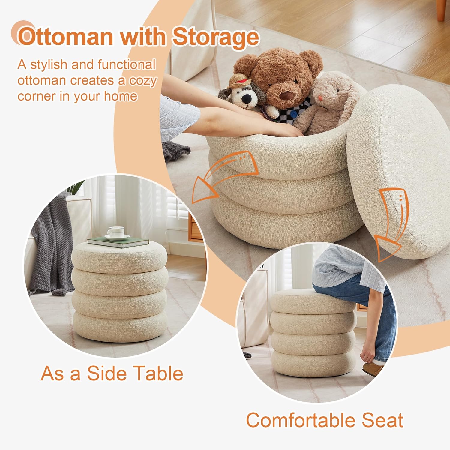 ONEVOG Round Storage Ottoman, 20" Small Ottomans Table with Removable Lid, Linen Fabric Soft Footrest Stools for Couch, Upholstered Stuffed Circle Seat for Living Room/Bedroom/Dorm/Vanity, Beige