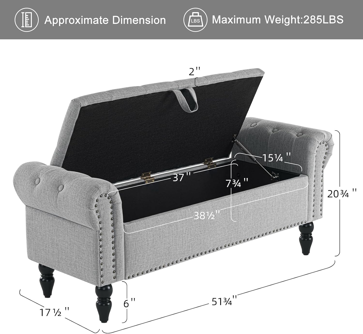 Furniliving 51.75" Storage Ottoman Bench for Living Room, Modern Bedroom Bench with Rolled Arm Upholstered End of Bed Bench Shoe Storage Bench Indoor Bench with Wood Legs Entryway Bench,Grey, Linen
