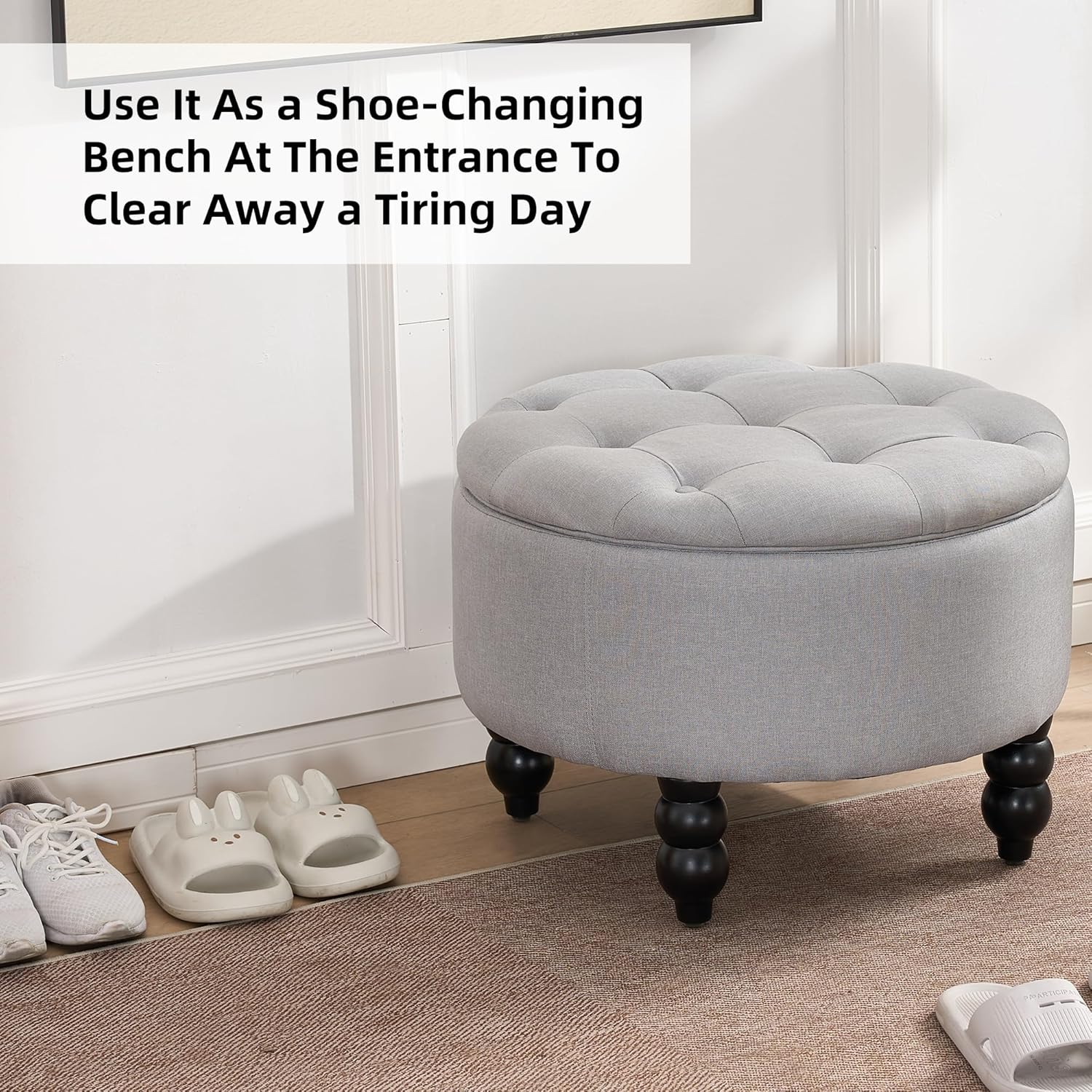 Fabric Round Ottoman with Storage, Upholstered Tufted Storage Footstool, Modern Wooden Coffee Table for Living Room, Bedroom,Light Grey