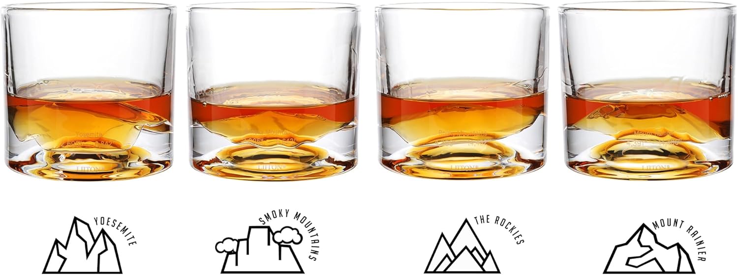 - ICONIC MOUNTAIN REPLICAS: This set features 3D replicas of Mt. Rainier, Yosemite, the Rockies, and the Smokies—each sculpted into the base of a crystal whiskey glass to aerate and elevate every sip of bourbon, scotch, tequila, or cocktail.