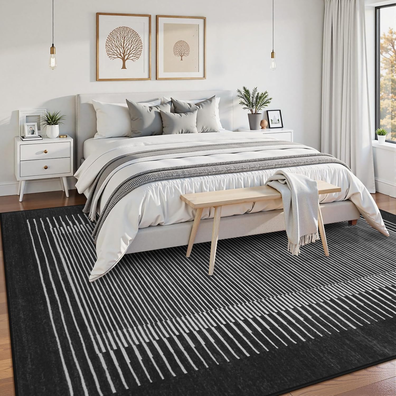 Wonnitar Striped Black Area Rugs 9x12 Living Room, Non-Slip Soft Berber Stripe Bedroom Rug, Low Pile Minimalist Floor Carpet for Dining Room Living Room Department (Black,9' x 12')