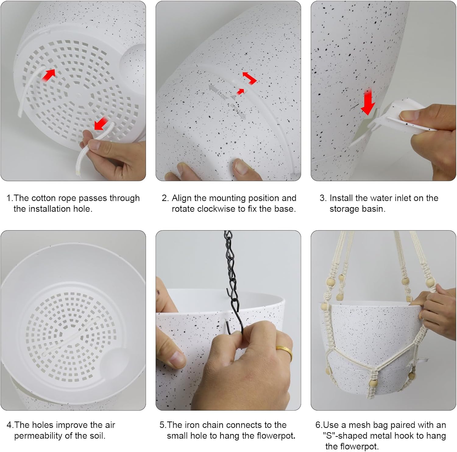 - 【Mesh Drainage Holes and Watering Lip】These hanging planters for indoor plants feature mesh drainage holes at the bottom.The separate watering lip design makes it even easier to water hanging plants. It's suitable for flower, succulents, ivy, herbs, ferns, or other plants
