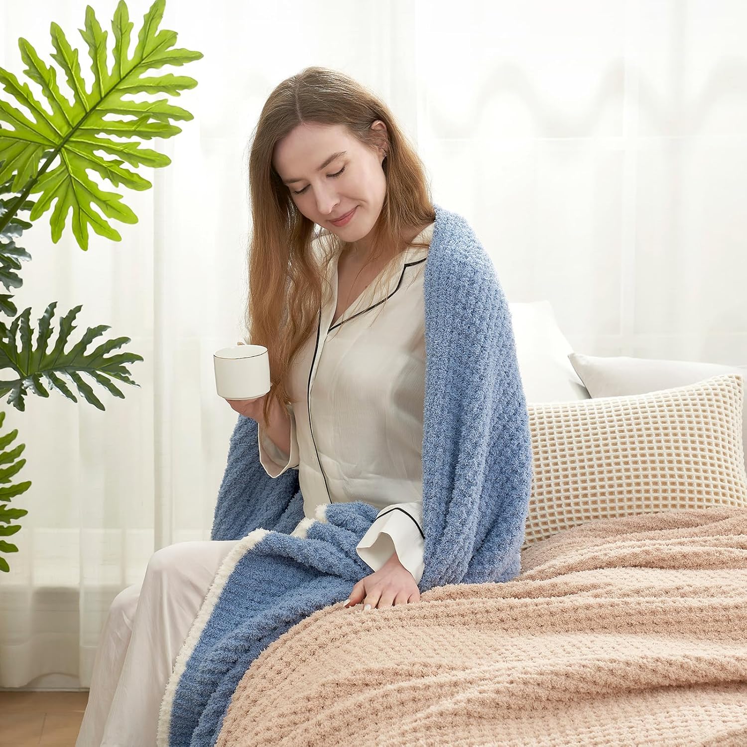 Snuggle Sac Blue Waffle Throw Blanket for Couch Bed Sofa 60x80 inches, Reversible Blue Blanket Microfiber Fluffy Fuzzy Cozy Knit Twin Blanket for Women Mothers Birthday Gifts