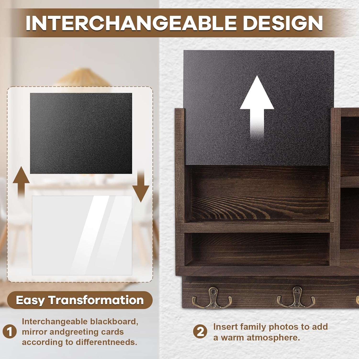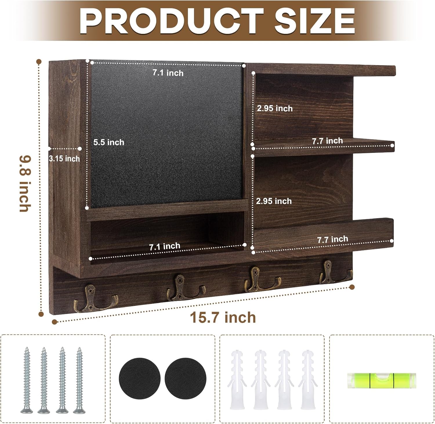 - Multiple Storage Shelves►This organizer wall-mounted key holder integrates 4 double-sided key hooks, mail organizer, chalkboard sticky note and 3 storage box. You can use the hanging organizer to hold keys, mail, wallets, sunglasses, hats, umbrellas, and more. This way you won't lose your keys and mail in the chaos as a result.
