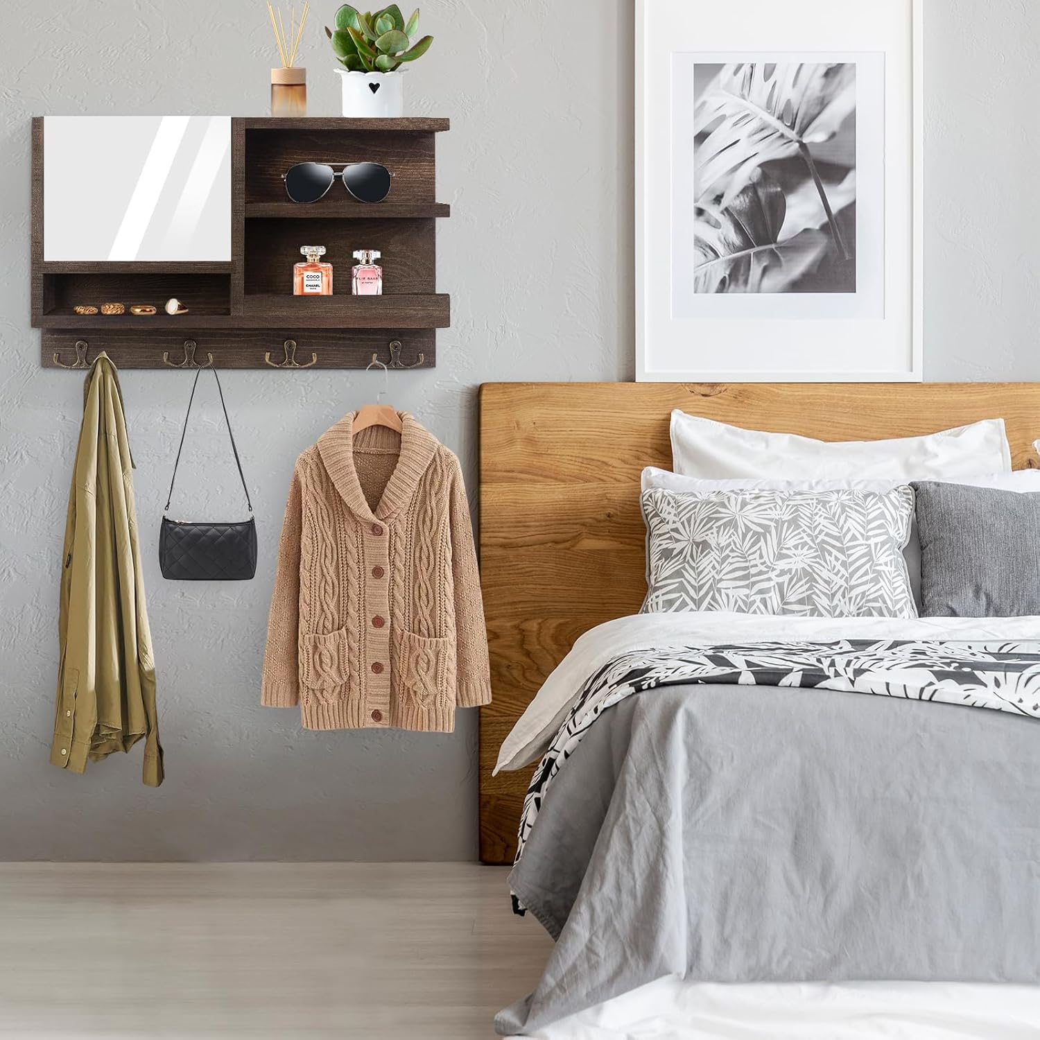 Key Holder for Wall, Mail Organizer Wall Mount with Key Hooks and Chalkboard & Mirror for Sunglasses Storage and Dog Leash Hanger, Decorative with 4 Double Hooks