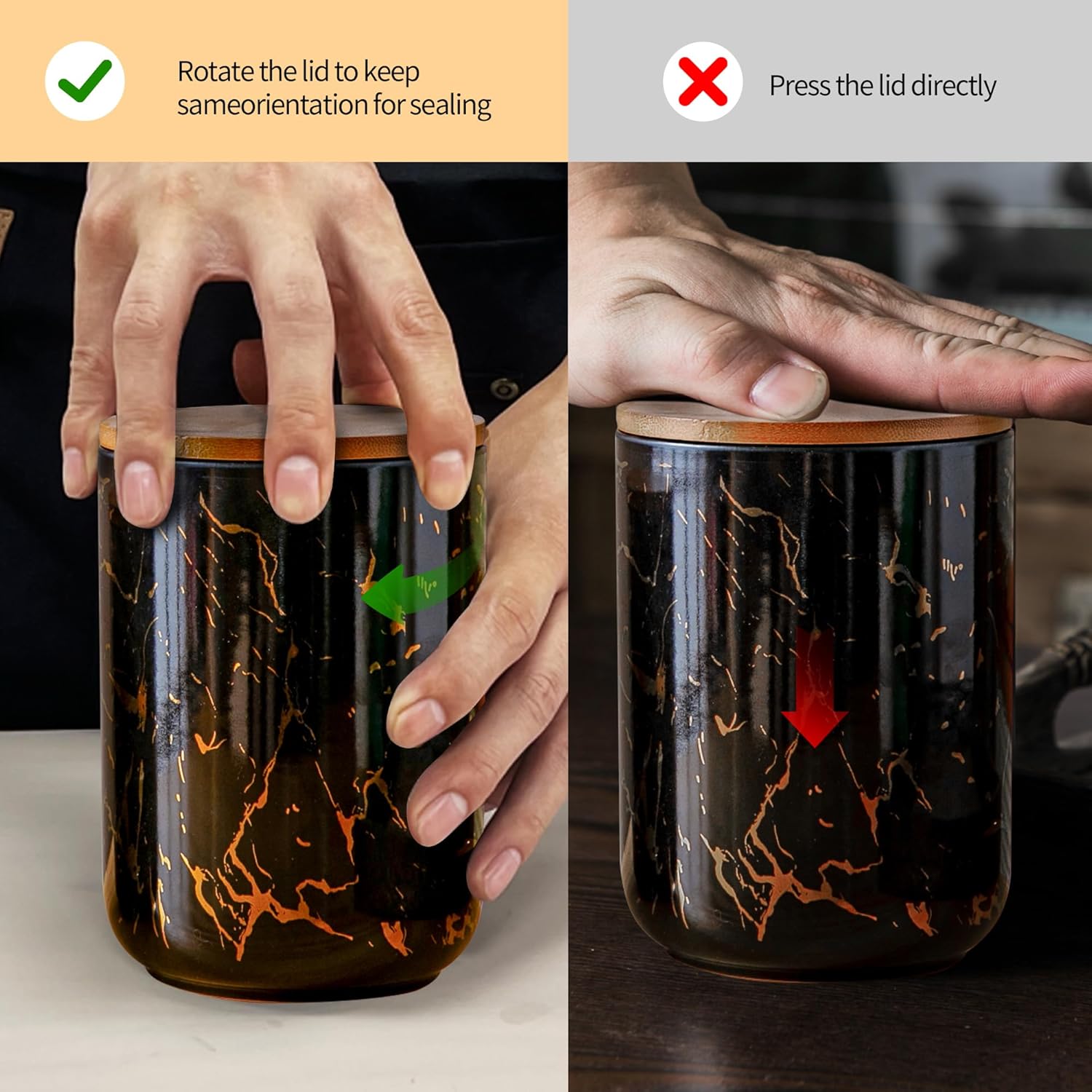 - Airtight Bamboo Lids for Freshness | Each jar is equipped with a bamboo lid and silicone seal, ensuring an airtight closure to keep coffee, sugar, flour, and other ingredients fresh and dry. Simply twist the lid to create a secure seal.