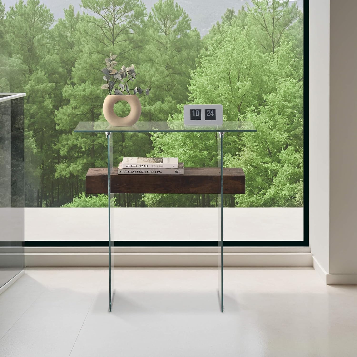 - Modern Glass Console Table: 8mm thick clear tempered glass tabletop with a smooth, beveled edge provides a perfect platform for framed photos or a stylish pair of lamps. Meanwhile, the two-tempered glass leg below gives your home an on-trend look. The console table can hold a weight capacity of 100 LBS