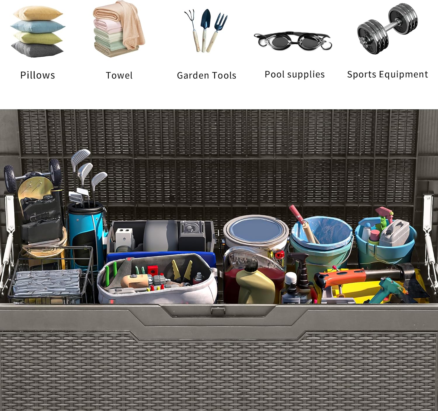 - Extra Seating: Doubling as a comfortable bench seat, this plastic deck box can support up to 485 pounds; Set it up in just 15-30 minutes, and enjoy its unique rattan-grain texture that seamlessly blends with any patio or deck decor in no time