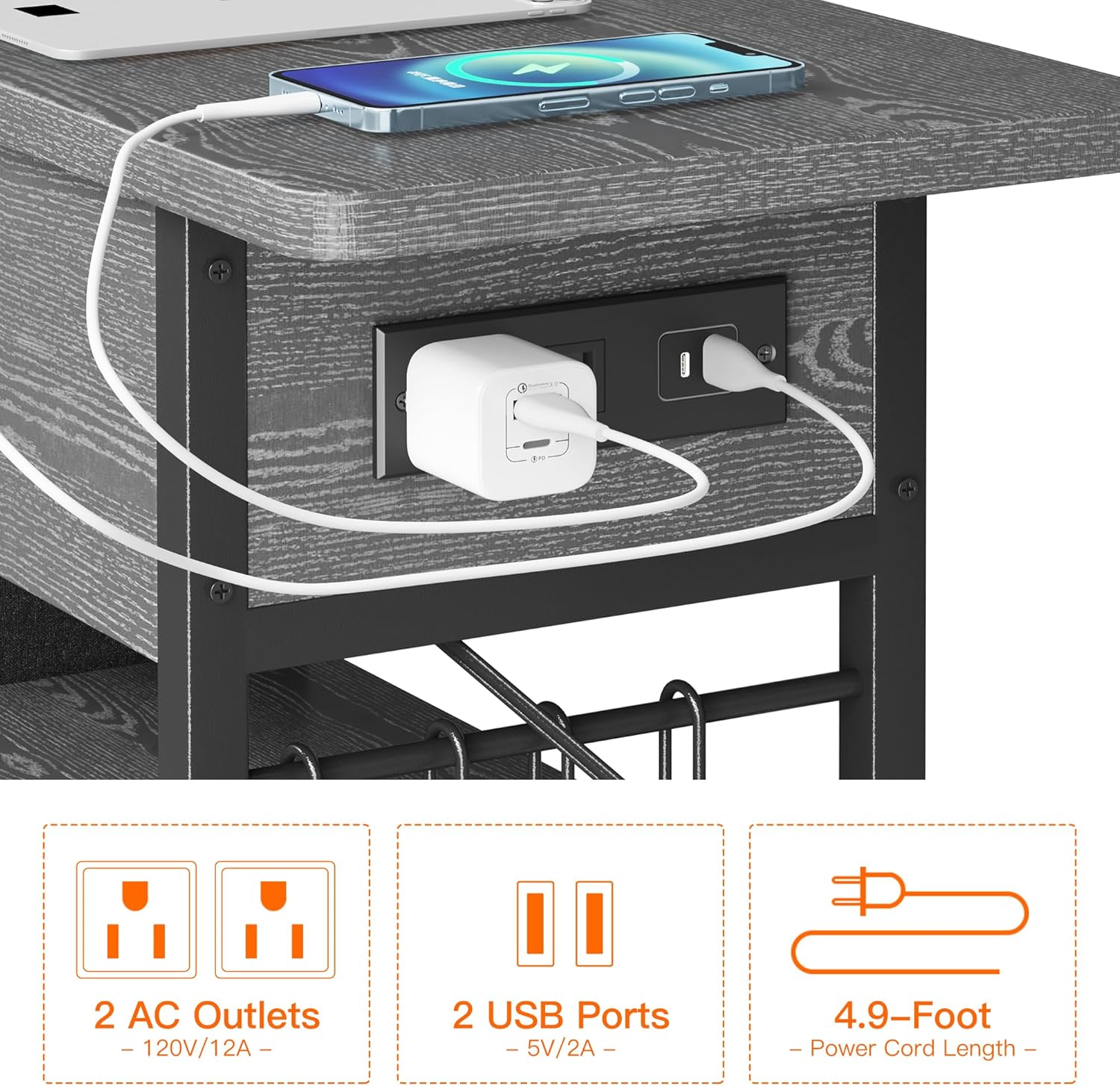 End Table with Charging Station, Flip Top Nightstand with USB Ports and Outlets,Couch Side Table with Fabric Bag and Hooks, Bedside Table for Space Saving, Living Room, Bedroom (Grey)