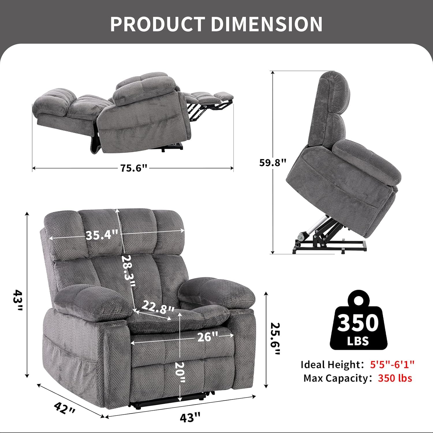 - Oversize Recliner: Featuring a spacious 26" wide seat and 35" wide backrest, this recliner is specially designed for big and tall individuals. Ideal for users between 5'5"โ6'1" and supporting up to 350 lbs, it offers superior comfort and support. The thickened front cushion stays firm even after long hours of sitting, providing enhanced thigh comfort without sagging