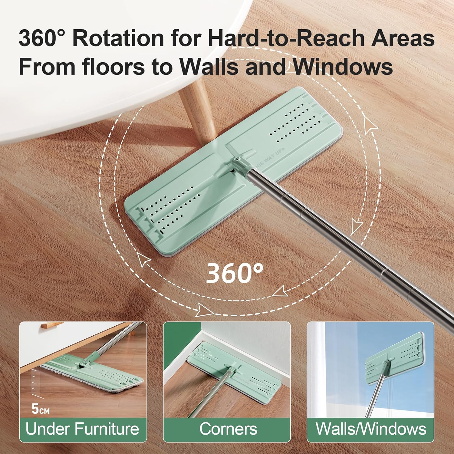 - [Extended Microfiber Mop] With 360Β°rotation and bigger mop head, the flat mop can reach to any corners, those "under-the-whatever" and more wider places for much faster cleaning job! The adjustable Stainless Steel Handles can be extended from 26.5 to 60.0 inches, great for wet dry mops or dust mops for wall cleaning