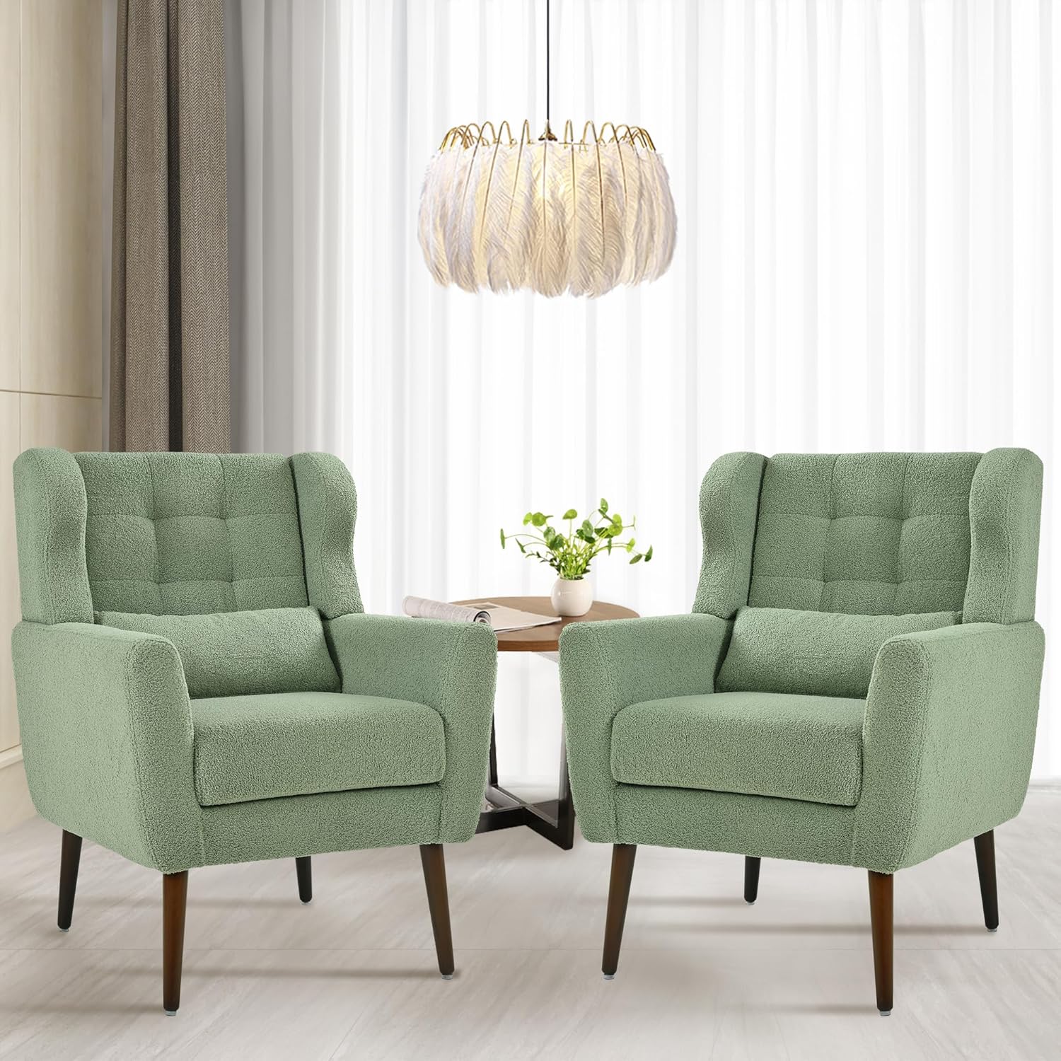 Accent Chair Set of 2, Upholstered Armchair with Pillow, Teddy Single Sofa Chair with Lounge Seat and Wood Legs for Living Room Small Spaces