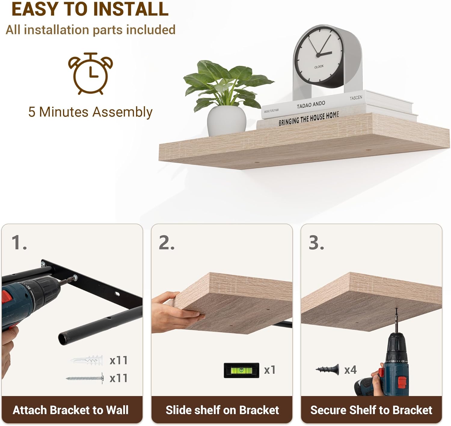- 【Easy Installation】Designed with user convenience in mind, these shelves come with all necessary mounting hardware and clear instructions. You can have them up and ready to use in less than 5 minutes. Plus, our customer service is always ready to assist with any queries or concerns, ensuring a hassle-free experience
