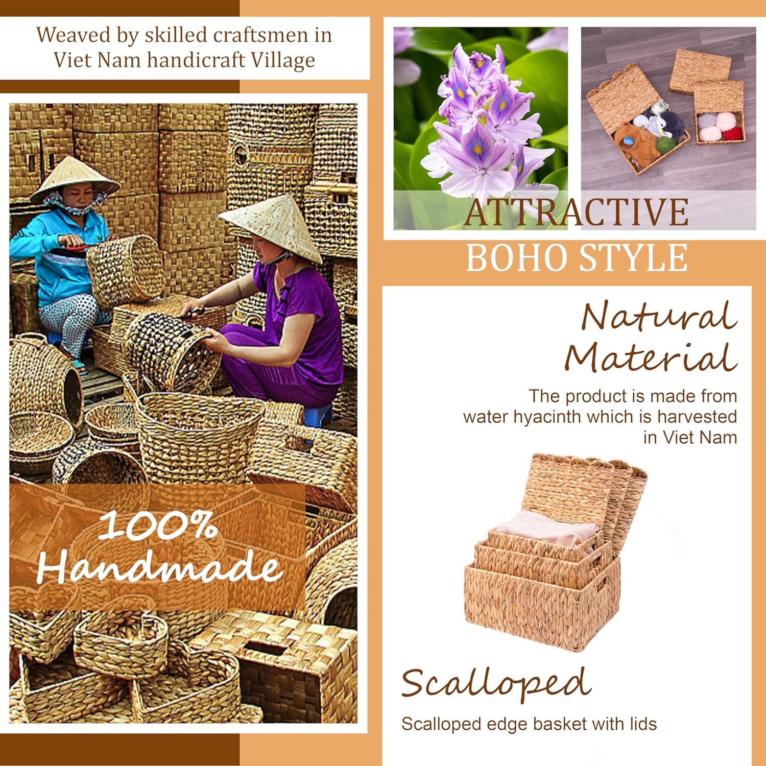 - 🎯 【Durable Material】: Wicker basket with lids is made of natural water hyacinth, so they may vary slightly in shape. Designed with a unique weave edge scalloped, these woven baskets are an irresistible piece to coordinate with your furniture. The lids open and close easily and prevent dust from settling on the stored contents.