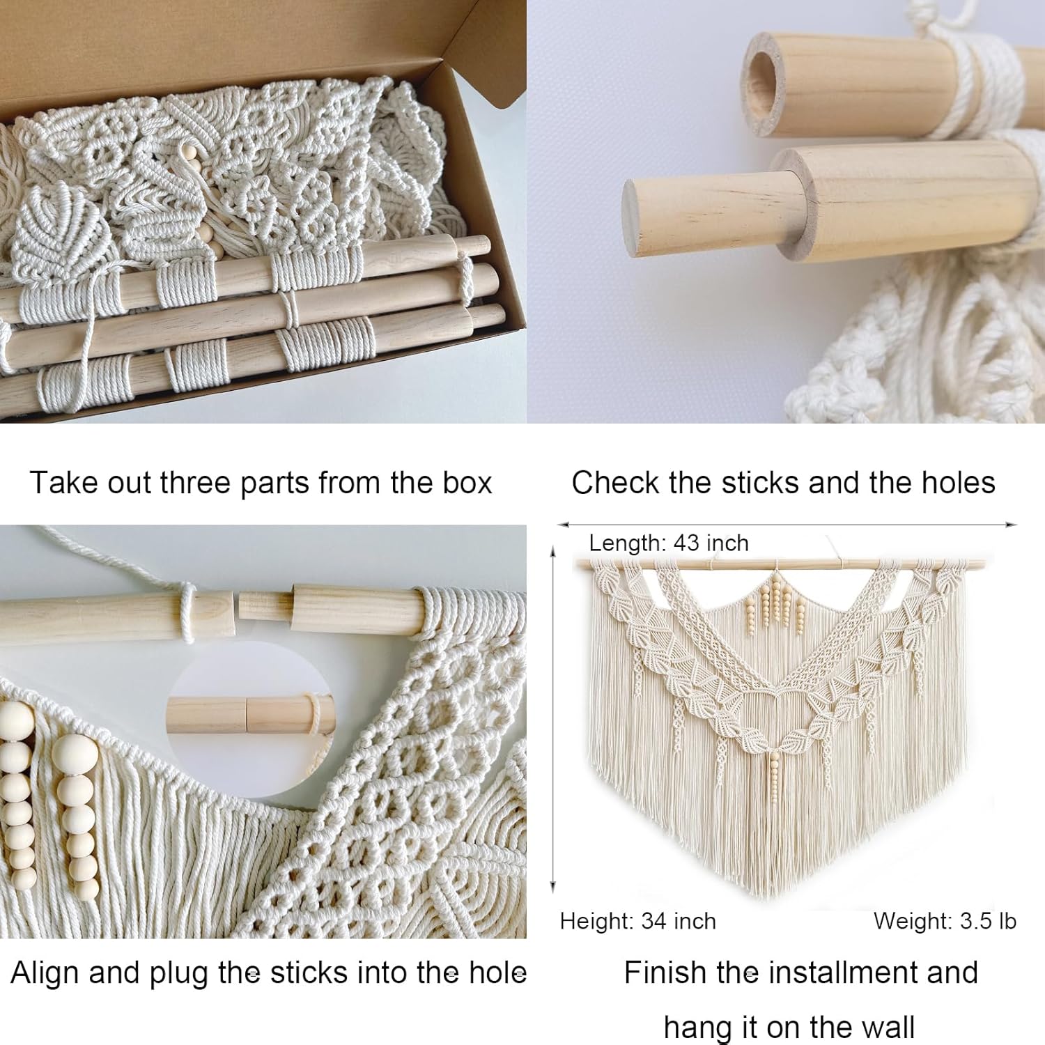 - Easy to Install: The package comes with 3 separate parts of short macrame wall hangings which could be easily connected together with the screws inserted in the wood rod.