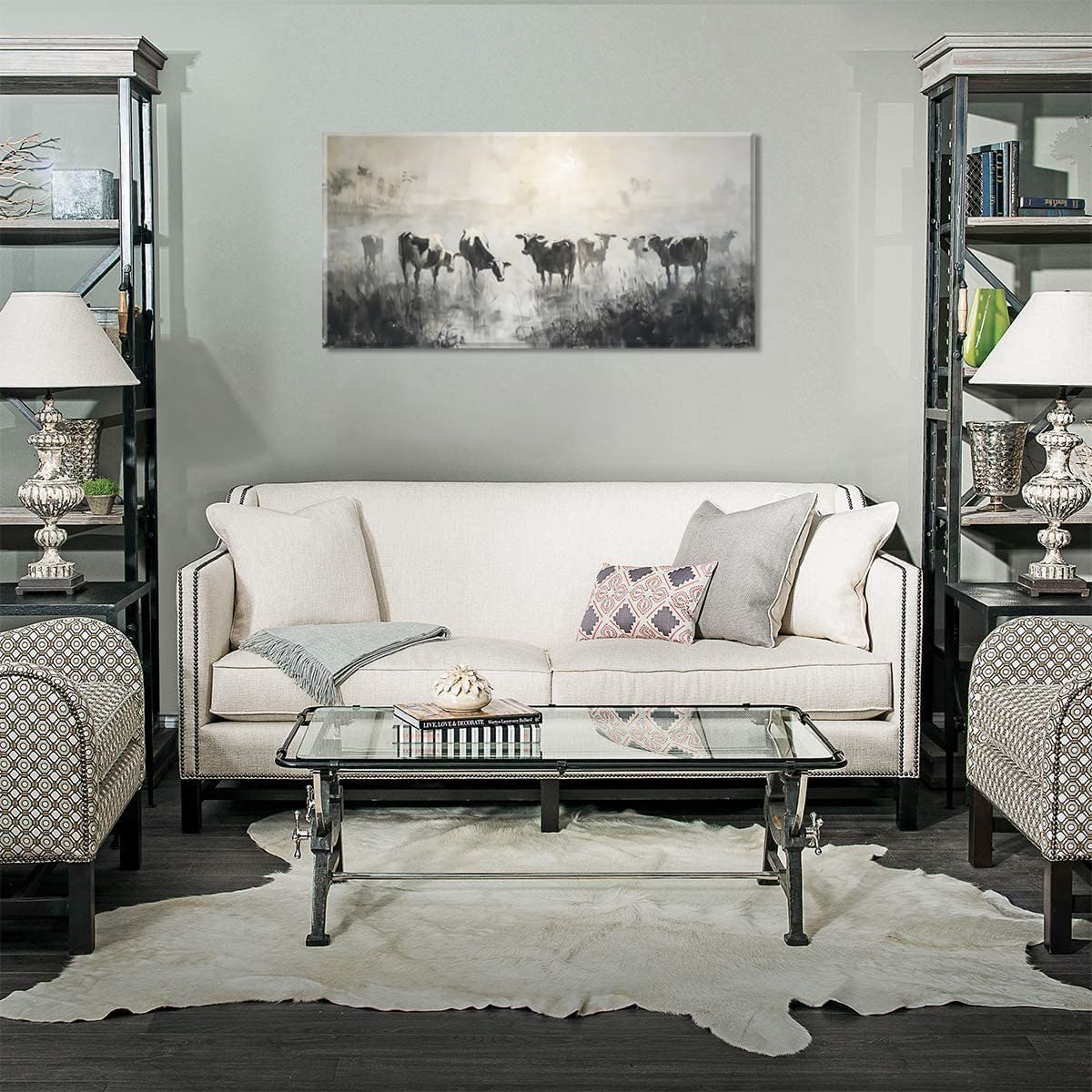 LASMOND Black and White Cow Wall Art for Living Room Ink Wash Canvas Painting Prints Morning Cattle Vintage Country Farmhouse Artwork Bedroom Office Decor (30x16 Inches)
