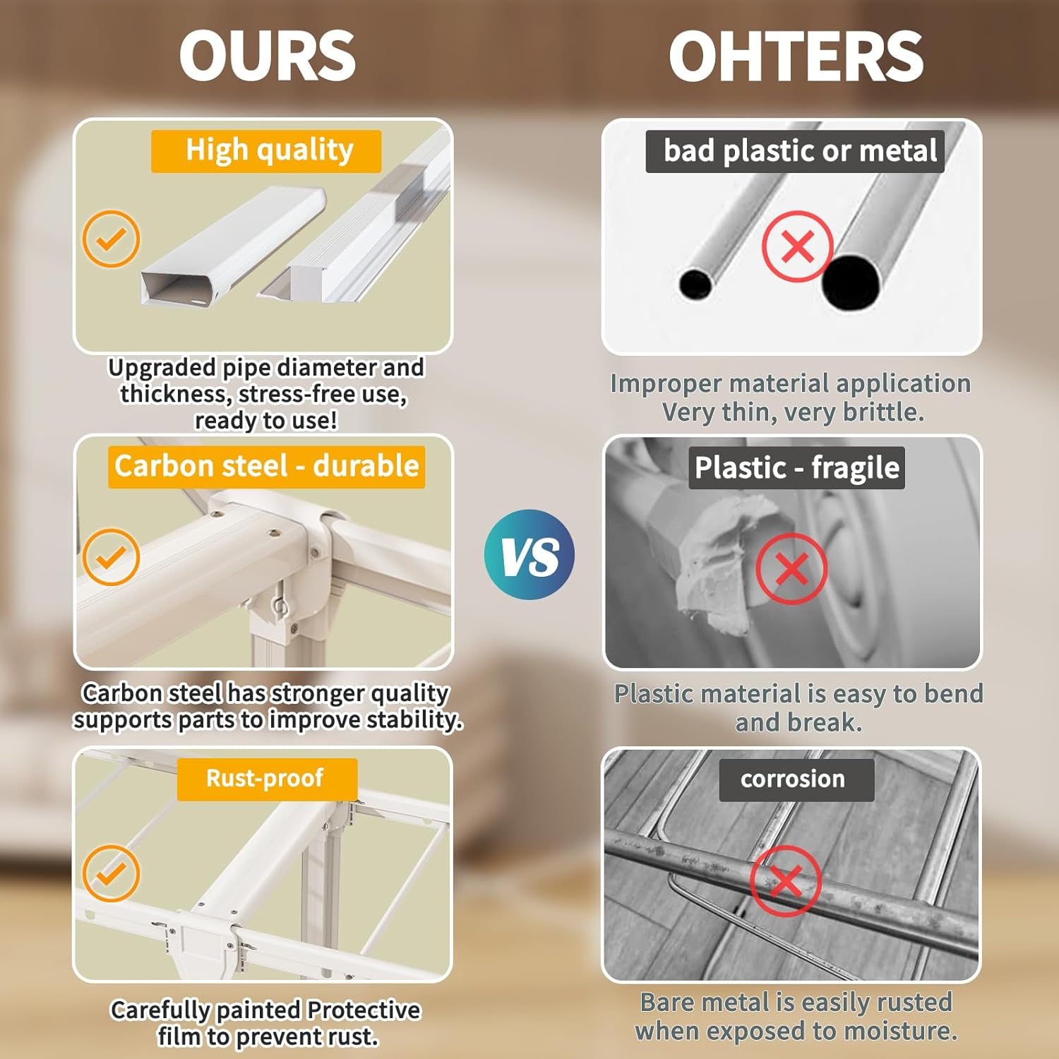 - γHigh-quality materialsγHigh-strength aluminum alloy clothes drying rack, designed for indoor and outdoor versatility, weather-resistant aluminum frame can withstand moisture, rain or sun, perfect for balcony, terrace, RV or indoor drying on rainy days. Its durable structure ensures it can withstand heavy loads without affecting its stability.