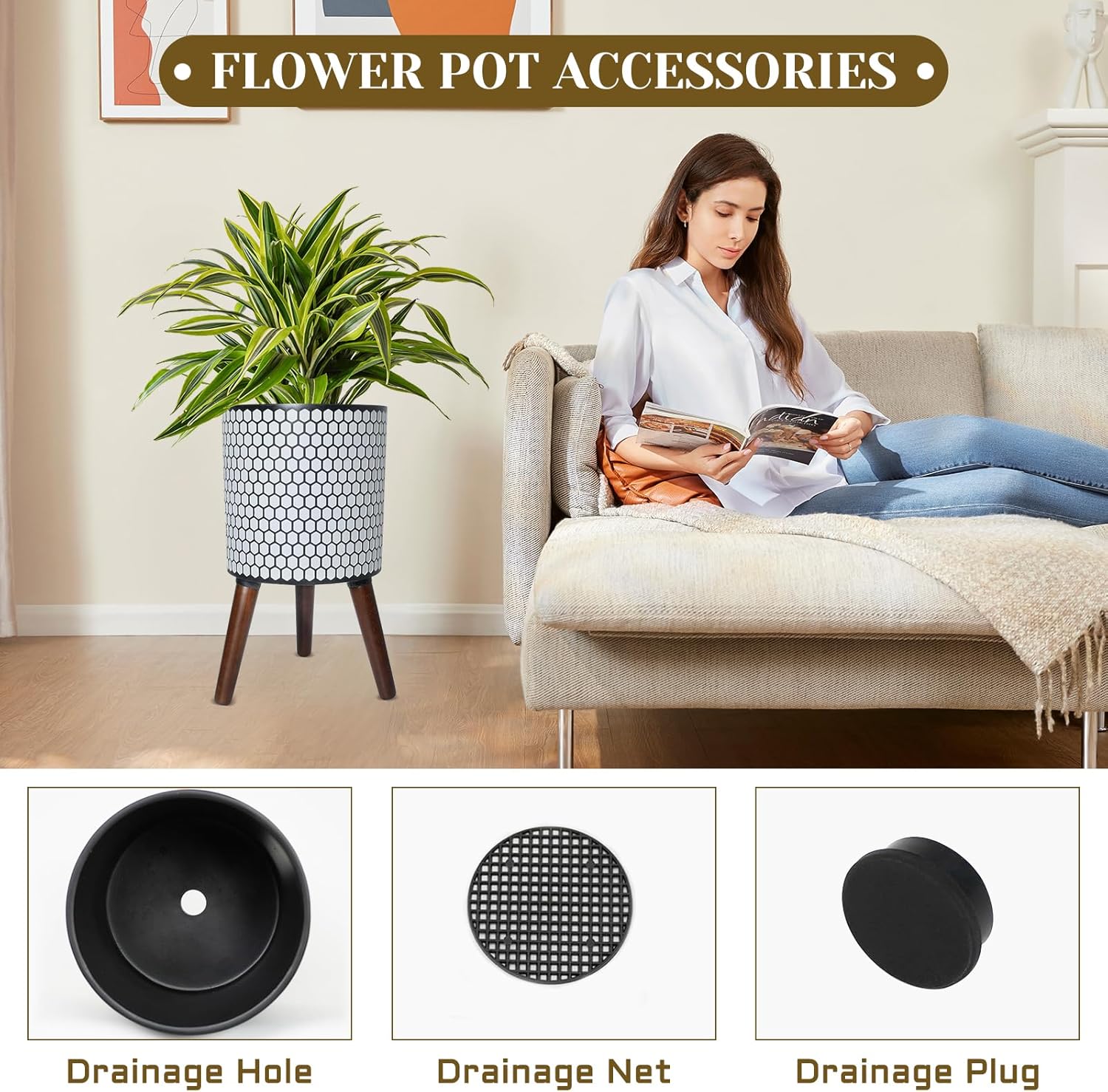 Flower Pot with Legs Tall Flower Pot with Drainage Holes for Indoor and Outdoor Decorative Planting (White Black Honeycomb, 12 Inches)