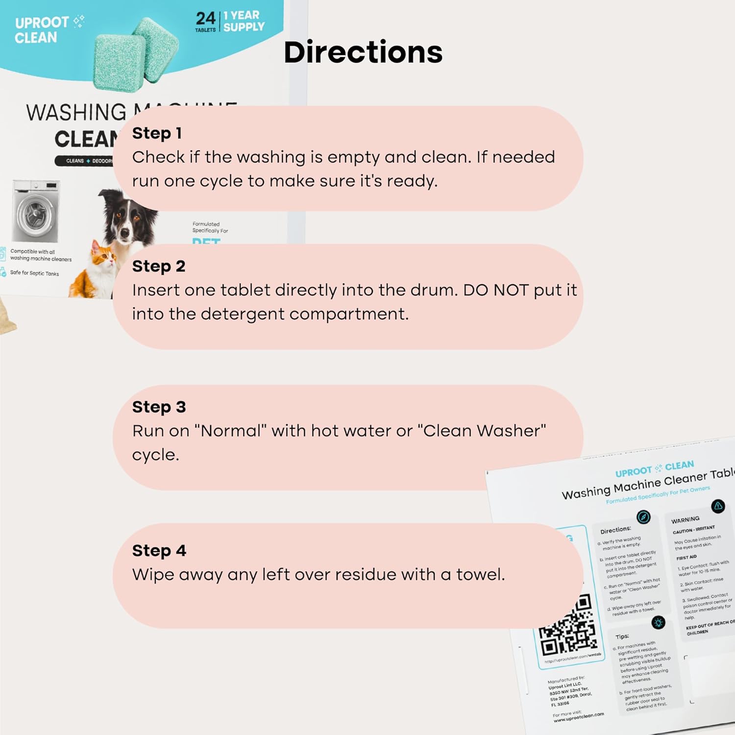 Uproot Clean Washing Machine Cleaner Tablets Ultra - 40% Stronger Formula: Designed for Pet Owners, Remove Residue, Grime & Odors, Compatible with HE, Top & Front Load, 24 Pack - 12 Month Supply