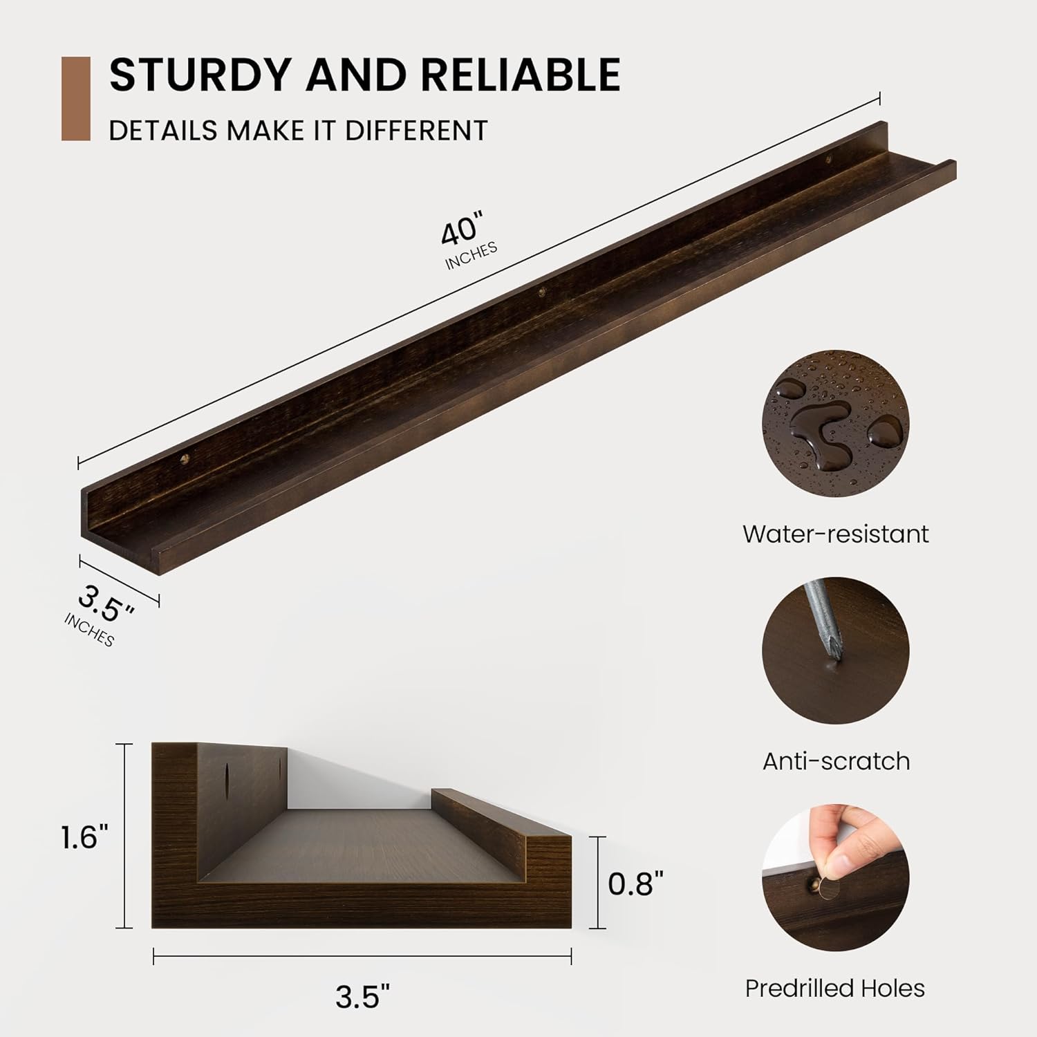 Picture Ledge Shelf, Solid Pine Wood Floating Shelves Set of 2, 40 Inches Nursery Book Shelves for Toys Storage, Kids Bookshelf Wall Mounted for Living Room Bedroom Decor Books Photo Frames, Walnut