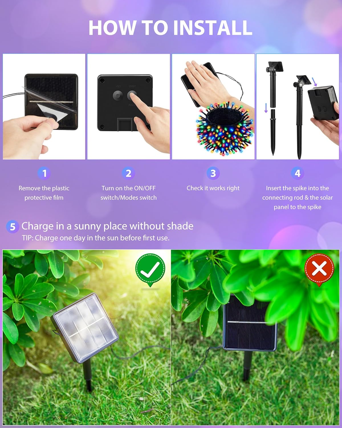 - Easy to DIY & Install: Solar powered string lights has 50ft lighting length with 120 LED, the bulb spacing is 3.9 inches, which can be easily installed in the place where decoration is needed. Also the outdoor lights have soft light cords that can be flexibly DIY designed into various creative shapes you want.