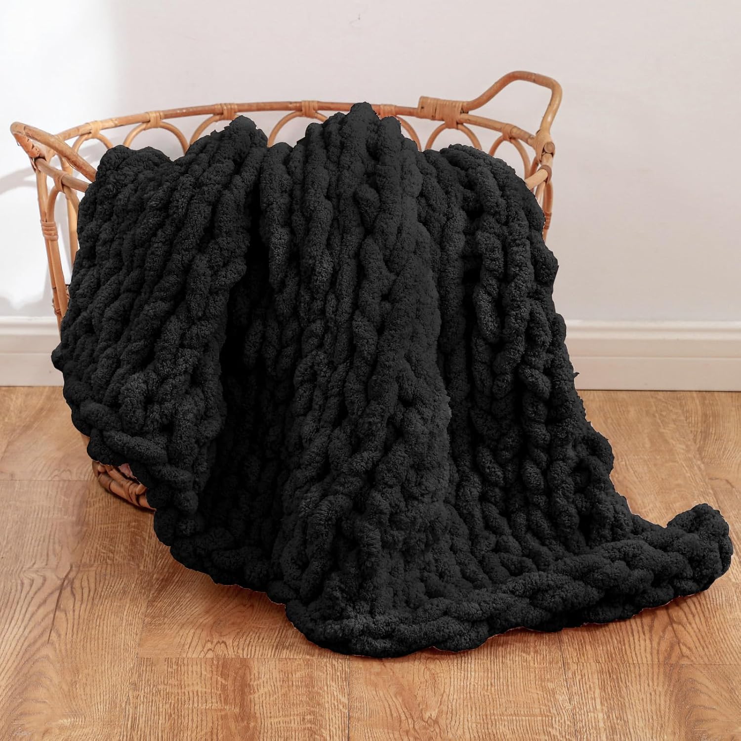 WESHIONGOO Chunky Knit Blanket Throw 40"*40" Knitted Throw Blankets for Couch Bed Fluffy Soft Blanket with Jumbo Chenille Yarn Thick 100% Handmade(Black)
