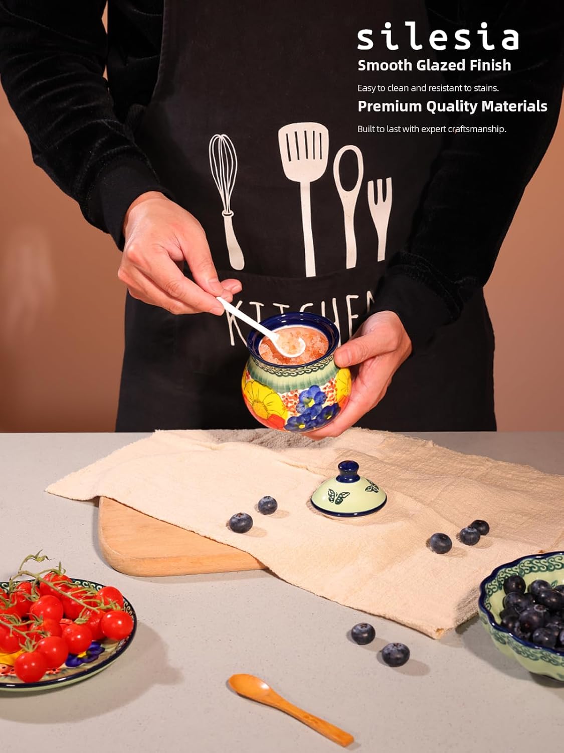 silesia Handmade Sugar Bowl with Lid and Spoon, 9 Ounce Ceramic Hand-Painted Sugar Jar for Home in Gift Box, Kitchen Decor, Oven, Dishwasher & Microwave Safe, Glazed Green